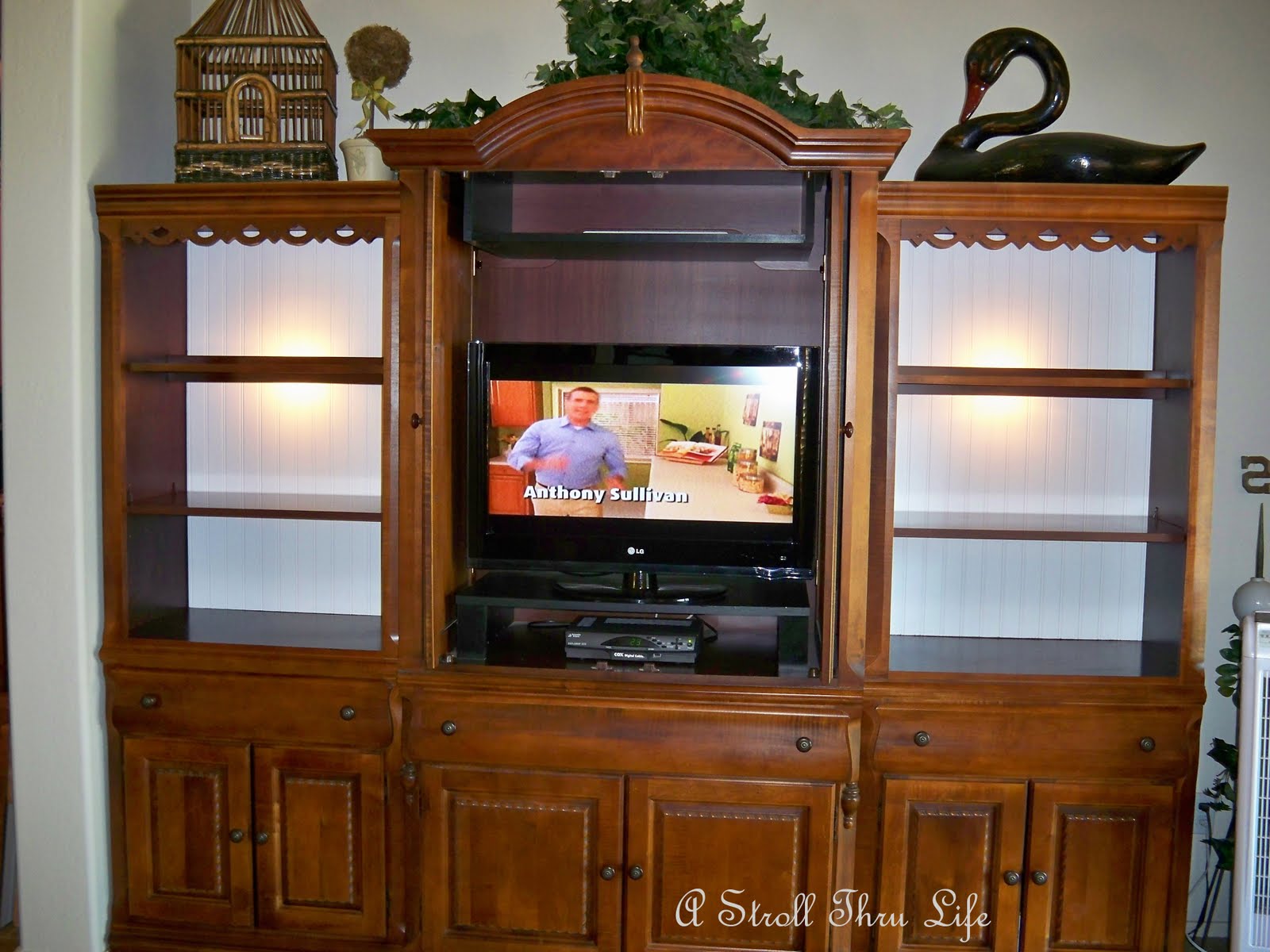 I showed you the beadboard that I added to the back of my Entertainment bookcases last week. It really made a huge difference.