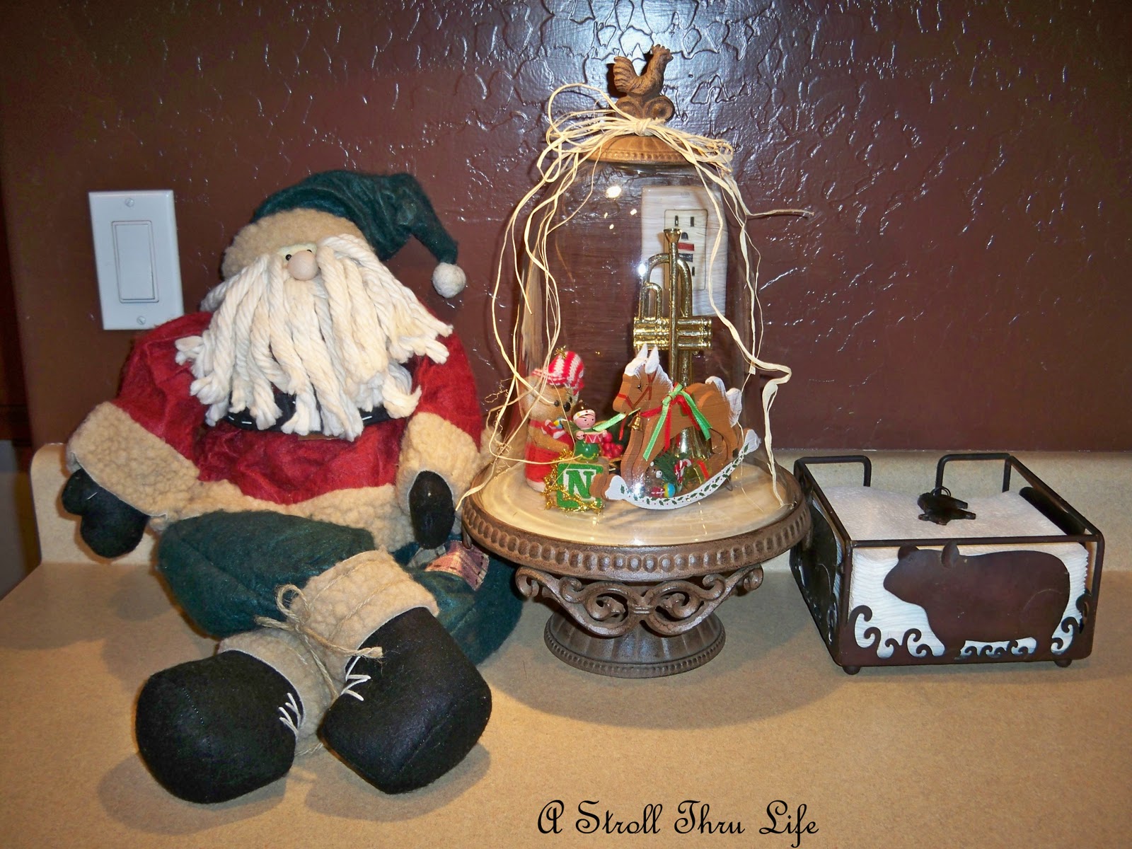 On the counter I thought a cloche with a toy theme would be fun for my Great-grandson.  I love this Raggedy Santa.  He is just so cute with his mop hair and patched pants.