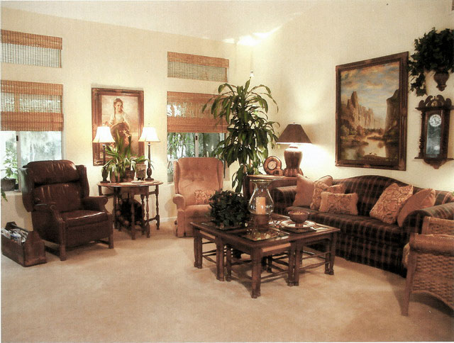 In the new smaller house, we again have the same furniture, but again in a much more neutral color scheme. Hummmmm, I like those woven wood blinds so much, maybe I need to get rid of the drapes and blinds and do the woven woods again. Something to think about anyway.