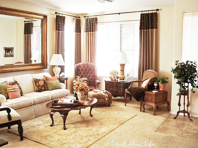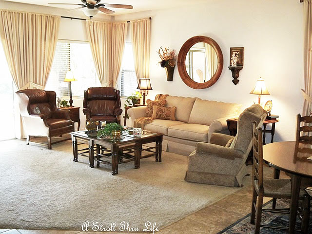 This was my living room in the last home we owned. You can see my red and gold period and much heavier drapes and area rug colors. Things have definitely changed, but notice I still have the same furniture in the same photo below.