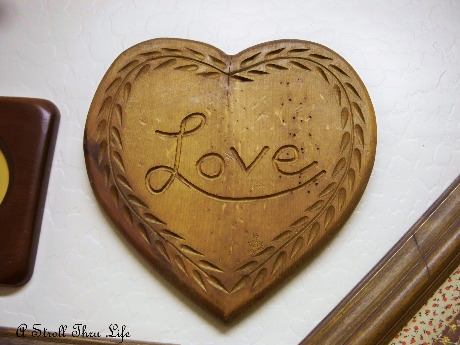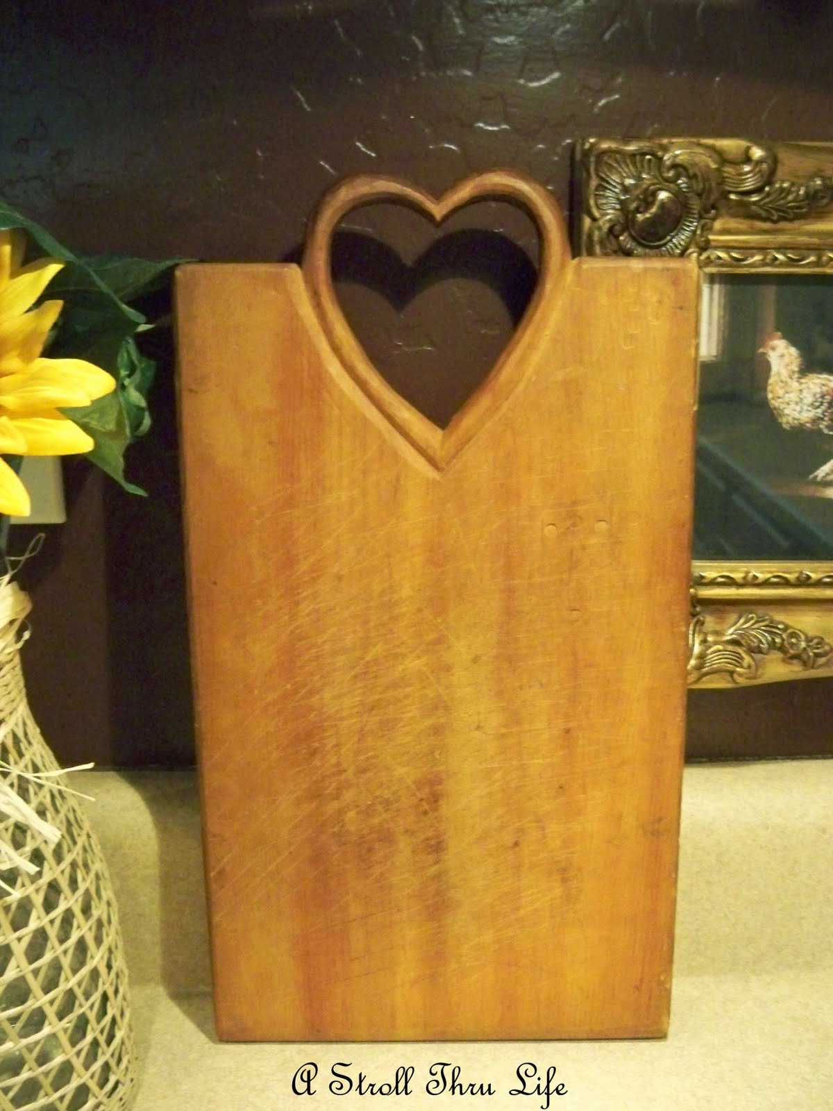 When I was straightening things in the garage the other day, I went through a few boxes of my treasures and I came across this fabulous heart cutting board that was given to me by the same friend. This one doesn’t have any date or signature on it, but it was lovingly used. Both sides show a lot of knife marks.