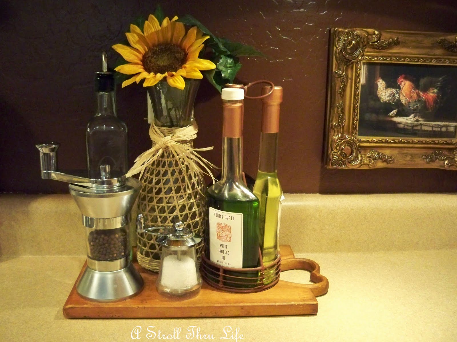 Such gorgeous patina and color after years of use. I decided that it was perfect to hold my oils and salt and pepper grinder by the stove. I added the carafe and flower for fun and some color.
