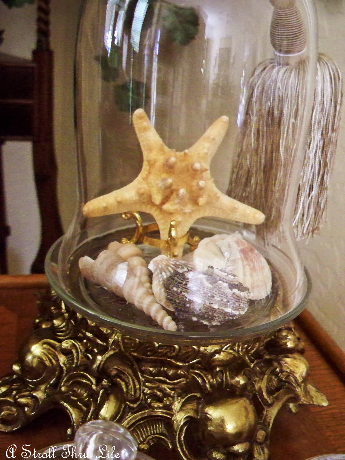 Just a reminder of the Summer Cloche Party that is coming up on 7/19, so I thought I would show you a little seaside display that I have in the living room.