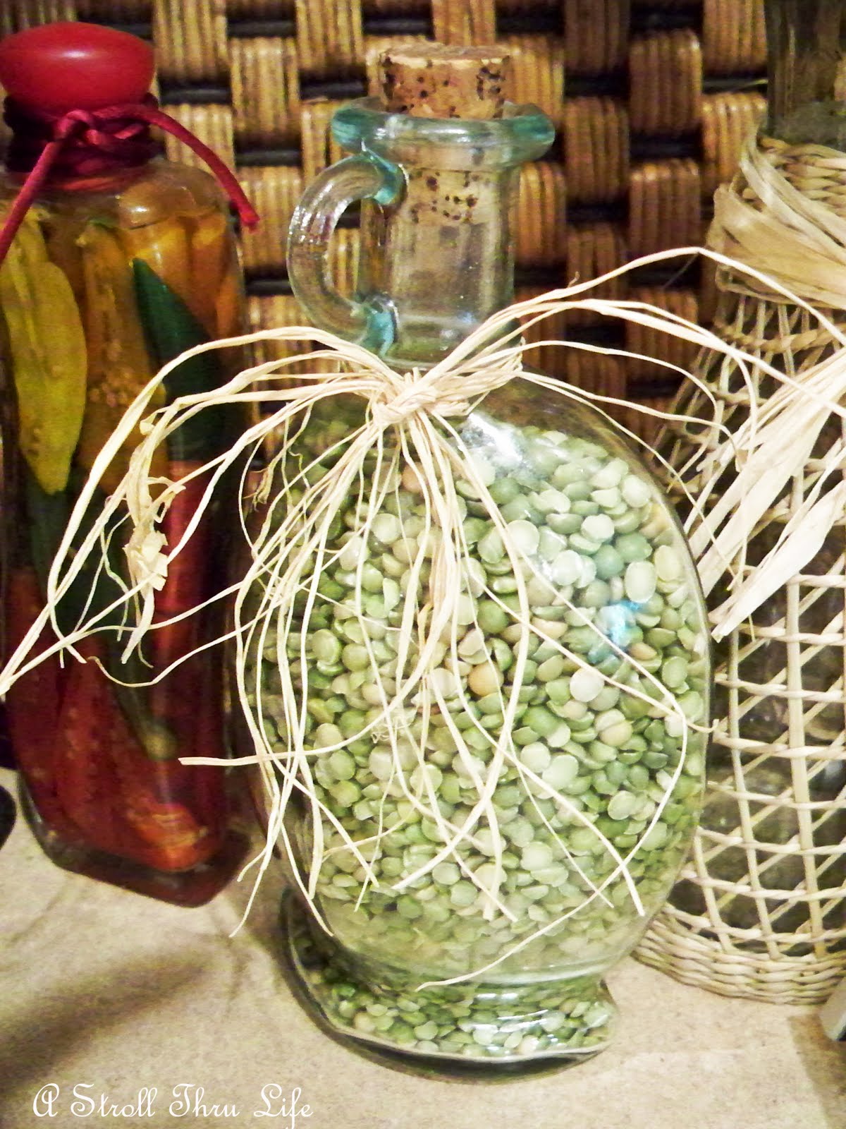 A cut little bottle filled with split-peas carries the green color through the whole display.