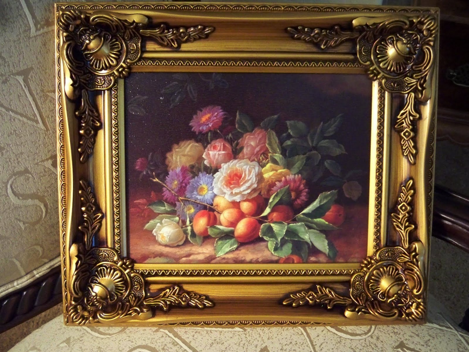I found a matching pair and although the artwork isn’t bad, it is just so-so. It’s the frames that I wanted. This still-life scene has beautiful colors and in person is really quite pretty. For $8 for the pair, I just had to have them. They’re each 11 x 14, so a good size for a small area.