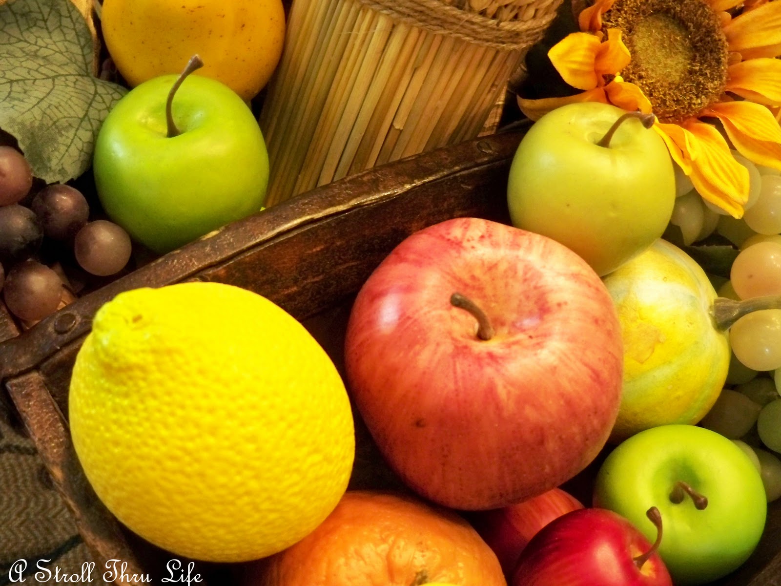 A couple of sunflowers, a bundle of wheat and all kinds of grapes, gourds and fruit.