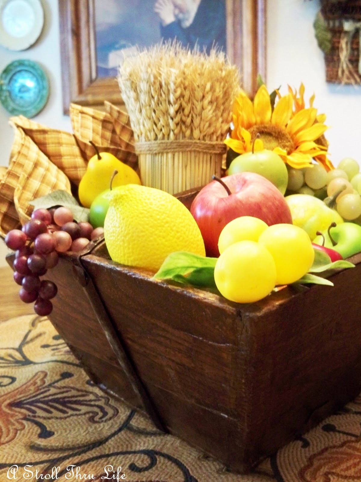 I love this wood antique bucket. It is so different. It was used to haul all kinds of things years ago. I think it’s the perfect container for a fun Fall arrangement for the breakfast table.