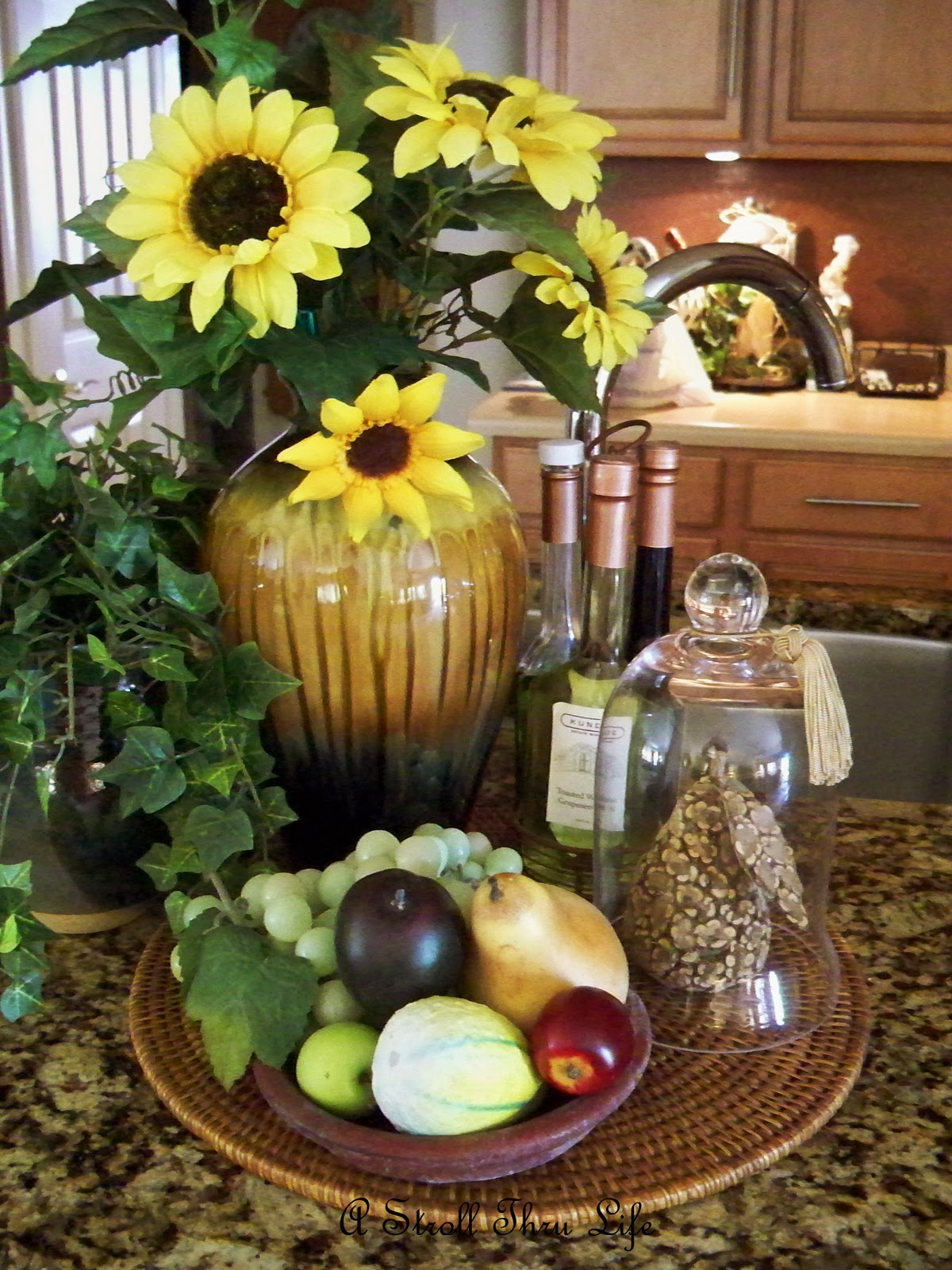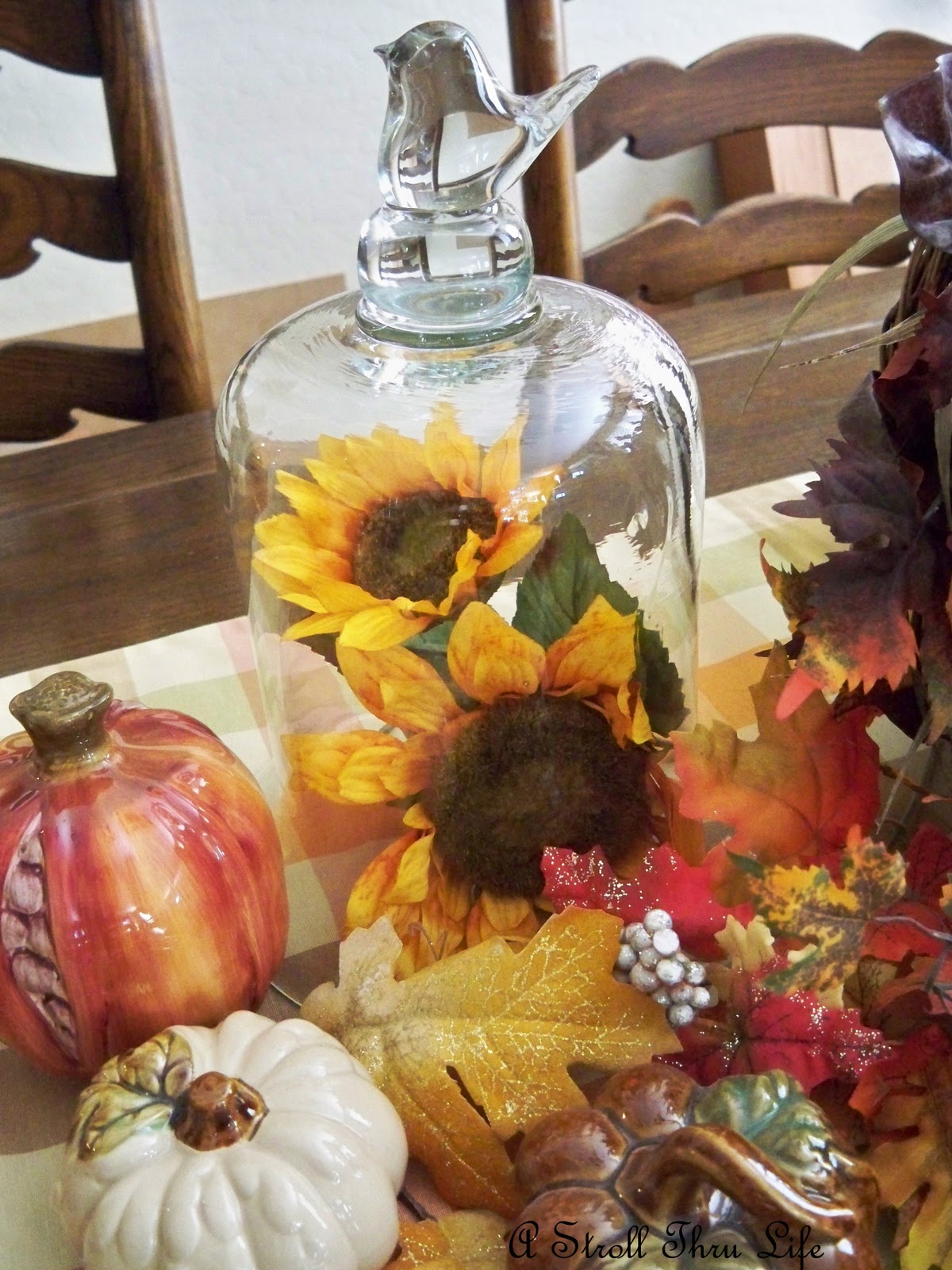 See, all I did was remove the silver bowl and pumpkin and add the cloche with 2 sunflowers inside.