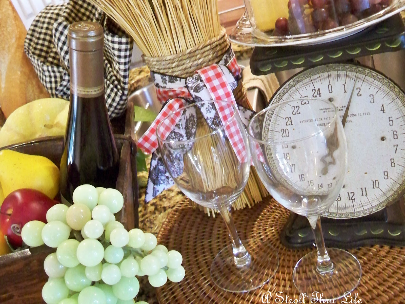 Did you all survive Thanksgiving. Ours was wonderful and we are having another one today, so I have a turkey breast and dressing in the oven, green bean casserole, candied yams, mashed potatoes, gravy and cranberry sauce all ready to go in the oven While that is all cooking away, I have been playing and creating another small French Country Christmas vignette for the kitchen. Here’s a little sneak peak.