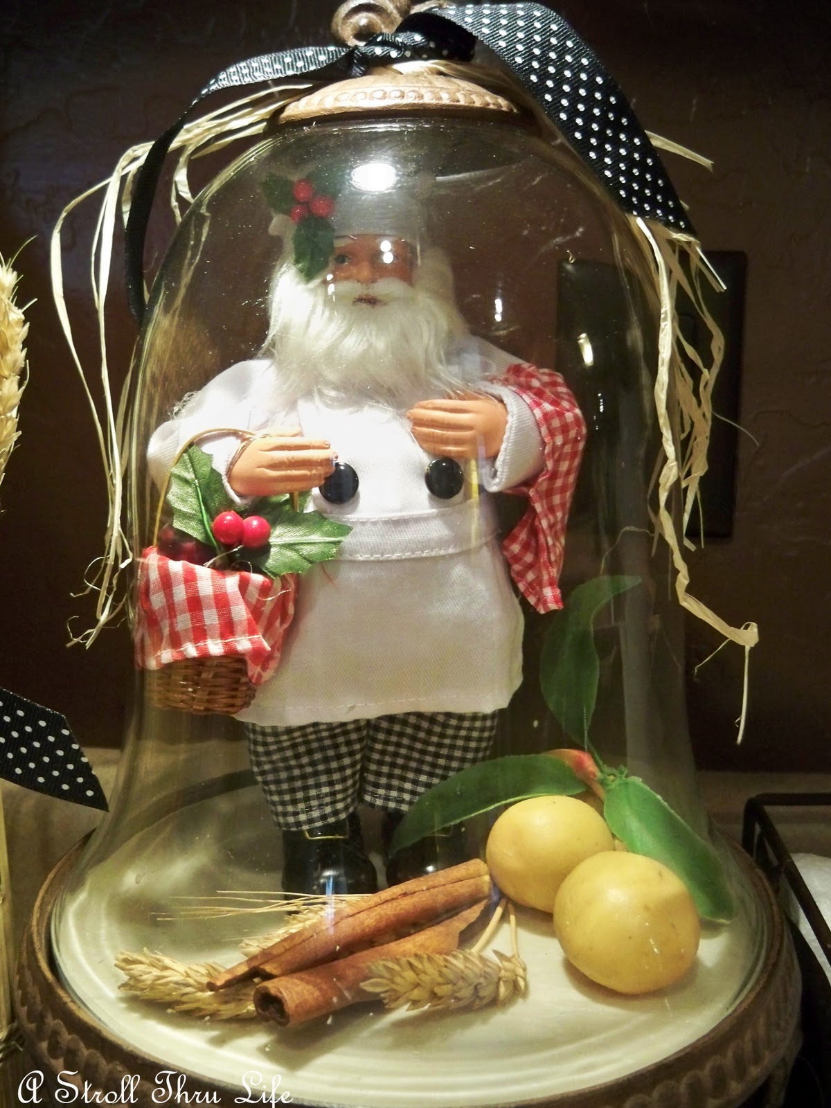 See my precious little chef that I found last year after Christmas. His hat and basket are decorated with holly and berries for the season. I’ve added some plums, wheat and cinnamon to the cloche, and I am sure he is going to cook something wonderful.