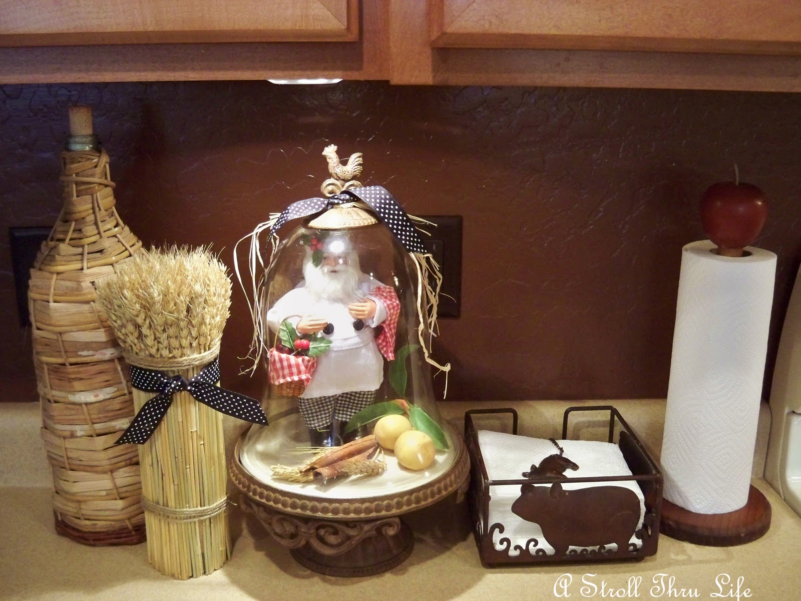 I did get another small vignette done in the kitchen. Just a really simple display using my favorite cloche, a demi-john and a stalk of wheat. I added a couple of ribbons to the top of the cloche and on the wheat to go with my black and red Country French Farmhouse theme.