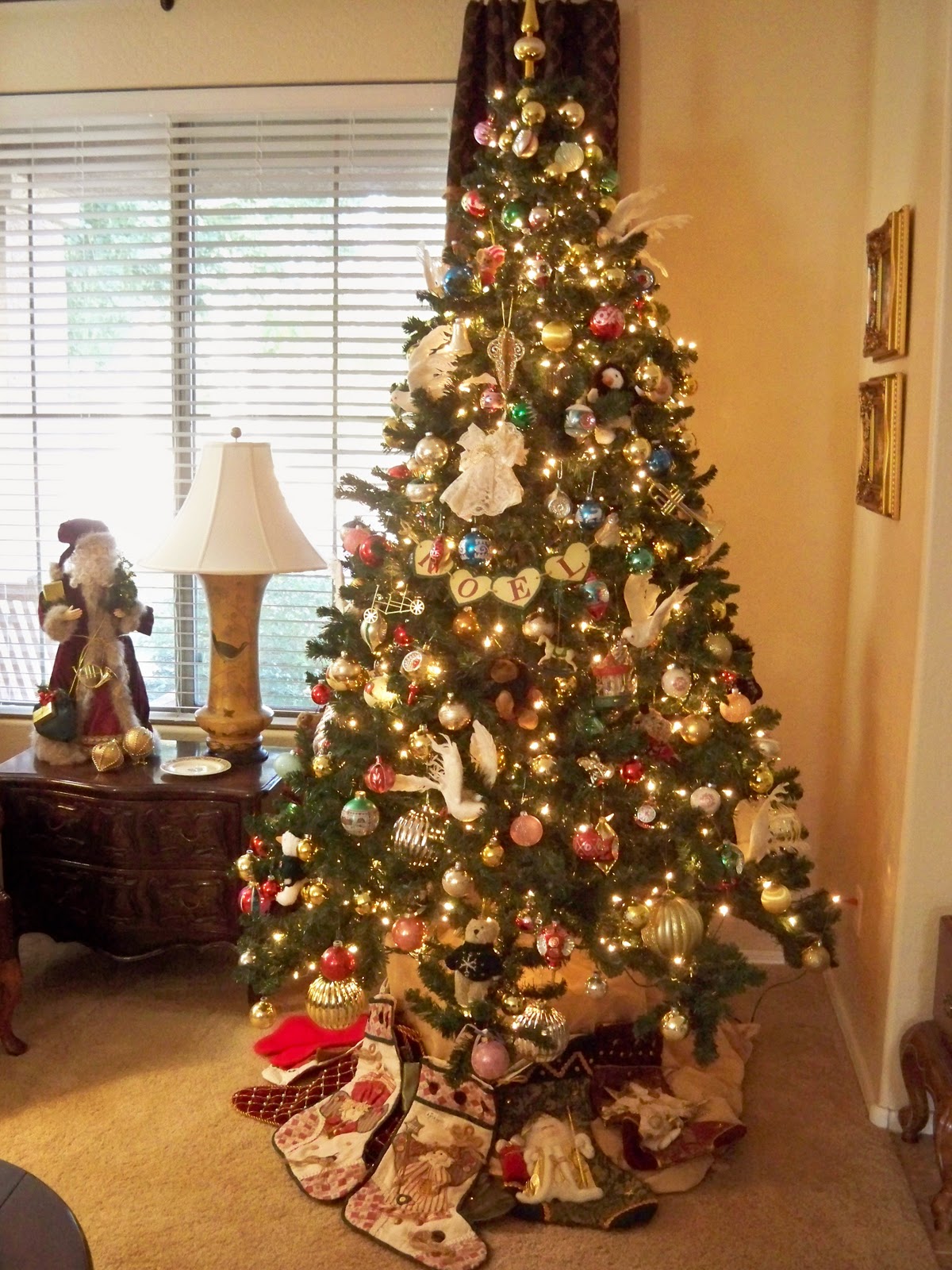 A daytime view showing the many, many ornaments, and all the stocking ready to be filled.