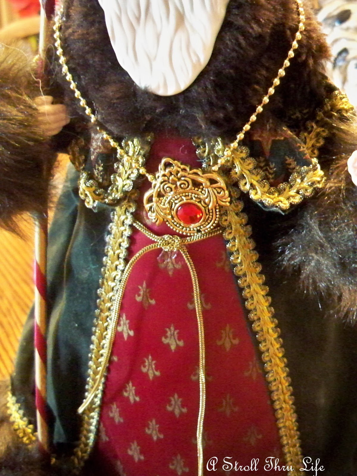 I am always fascinated at all the ornamentation that is added to Santa’s robe and dress. Fabulous silk dress with gorgeous trim on his velvet robe and tons of fur trim. He even has a beautiful gold and ruby necklace.