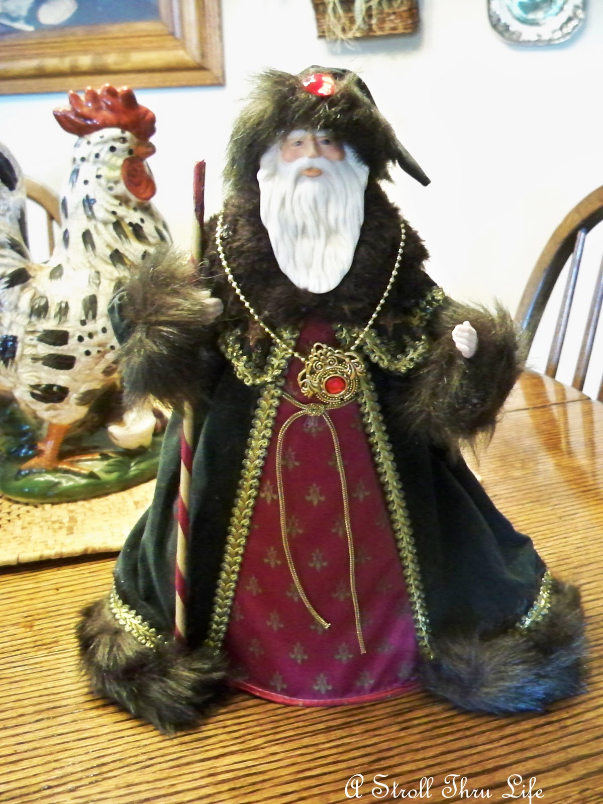 A few years ago I bought one of the Old World Santas and fell in love with all of them, so I started trying to collect a different one every year. I hadn’t had time to look for one yet this year and then of course when I was at GW, what in the world was just sitting there ?, A fabulous Old world Santa completely different from the ones I already have. I found him a couple of weeks ago, I just hadn’t shown him to you yet. He is in my header collage and I think he is a great addition.