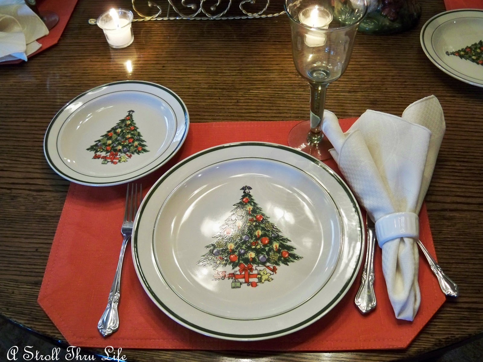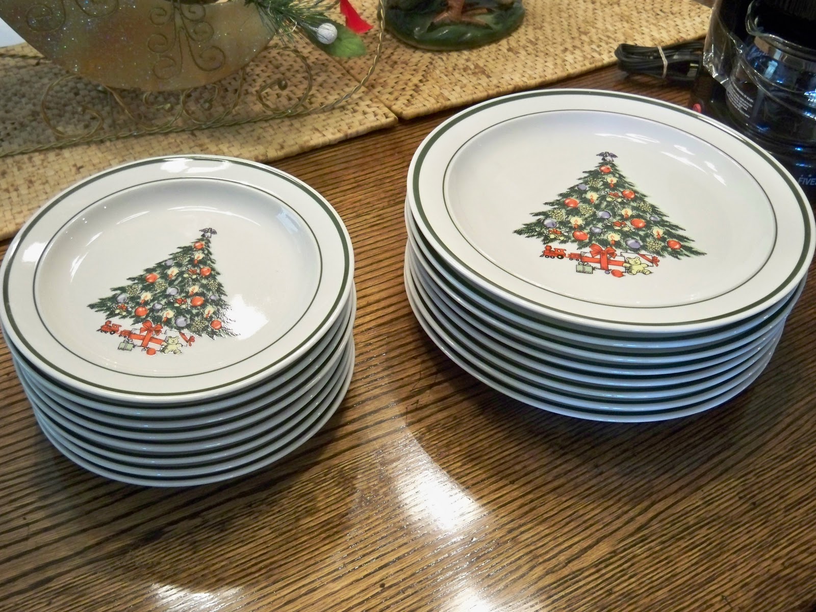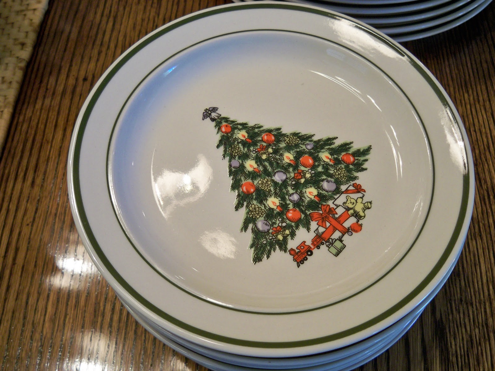 Dinner plates, I like the old fashioned decorated tree. These are simple stoneware dishes, nothing fancy, but fun.