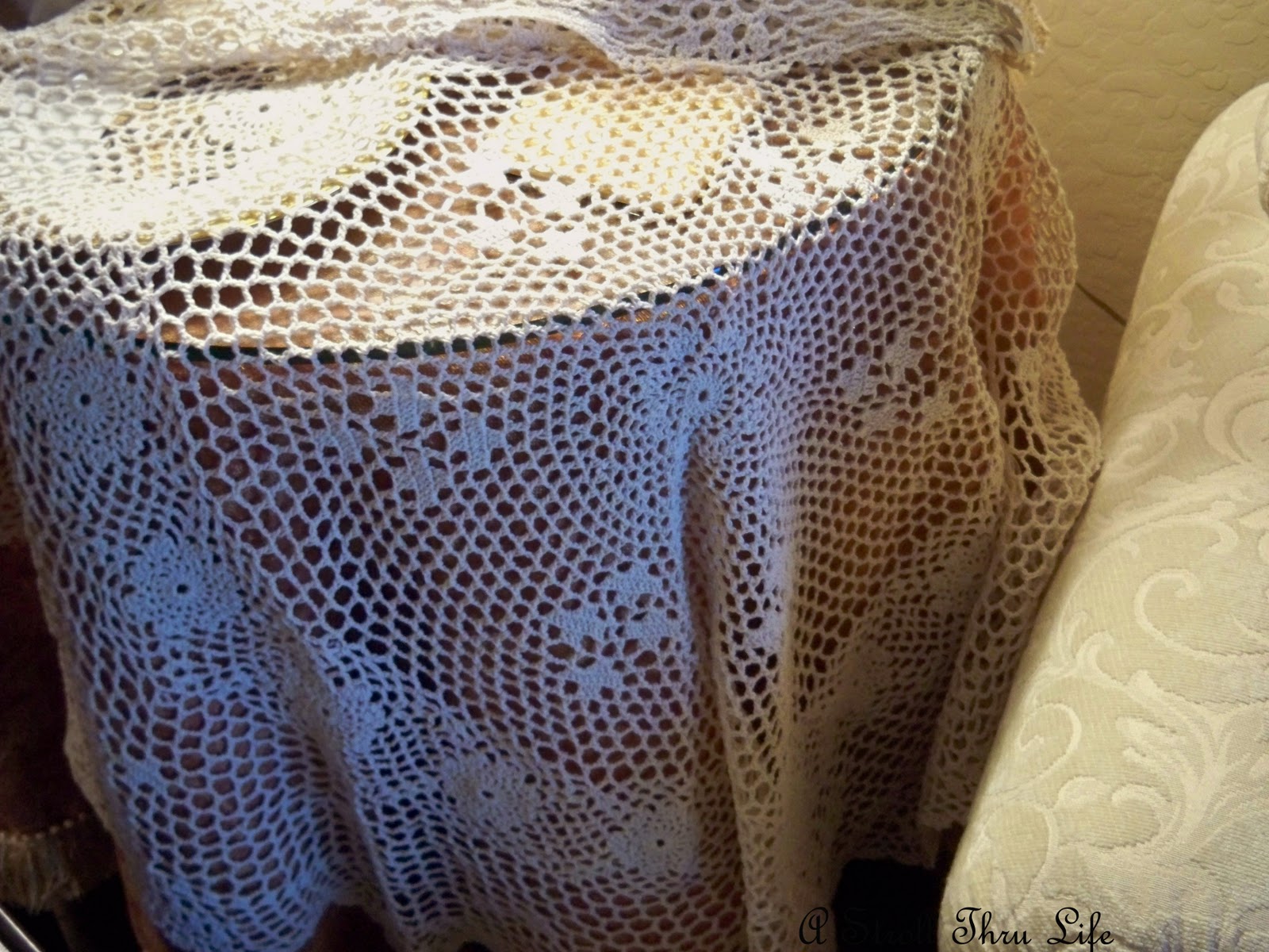 I found this lovely crocheted table topper, maybe layered over a simple cream cloth.