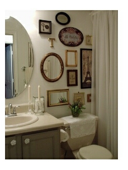#2  Redo the Hall Bathroom.  I have a standard builder grade nothing special bland bathroom.  Vanity, cultured marble top and sink, plain faucet and the standard square slab mirror.  I am dreaming of new paint, fixtures, vanity mirror and I totally love this wall college.  This picture I borrowed from the header of The Shabby Chick.  If you aren’t familiar with her blog, be sure to visit, you will love her style.