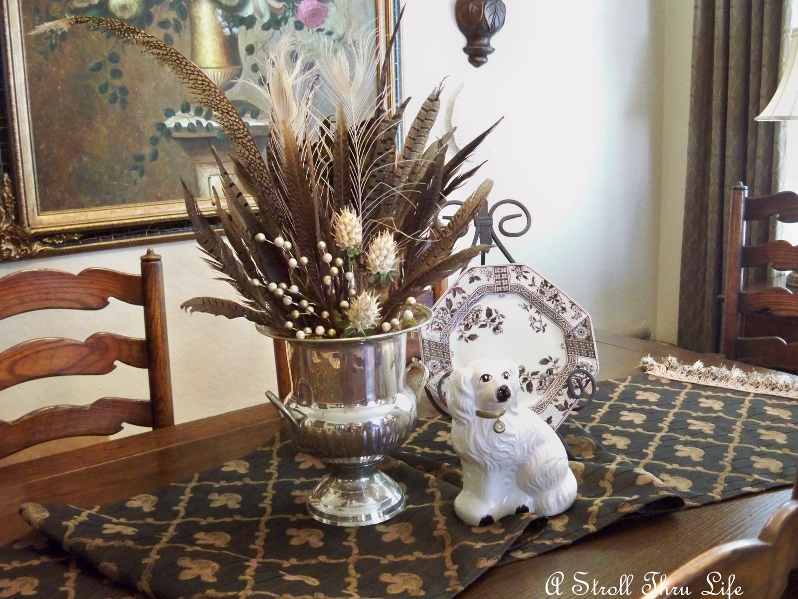 When I was doing the spring cleaning in the LR and DR, I decided to use the plate on the DR table in a vignette. I moved the silver champagne bucket floral arrangement from the coffee table and added my little dog figurine. A dark brown table runner finished off the display.