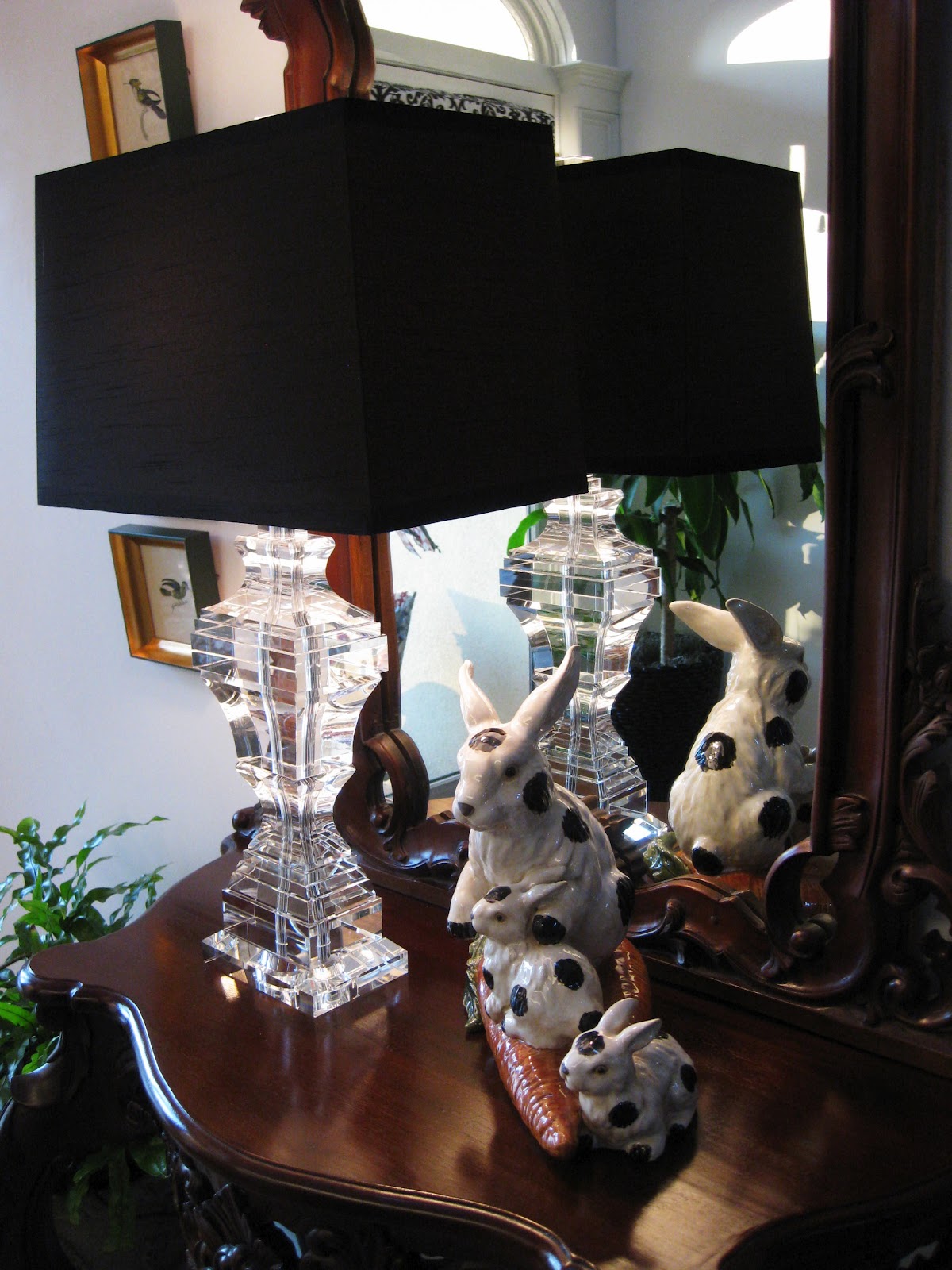 Don’t you just love that fabulous glass lamp and look how cute those polka dot bunnies are. Rhonda @