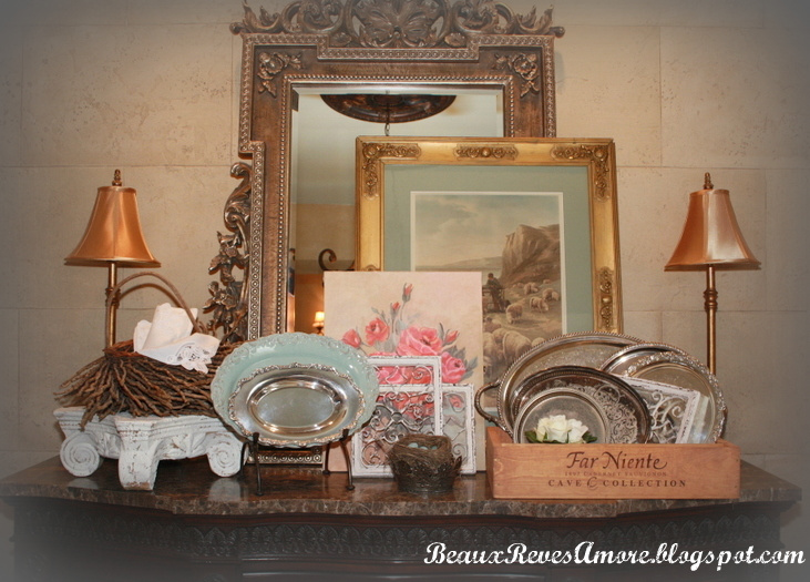 I love this fabulous vignette Cindy created on her buffet, look at how she incorporates bits of nature and then some fabulous silver, frames and that mirror is to die for. Be sure to visit Beaux R’eves and you will be drooling tool