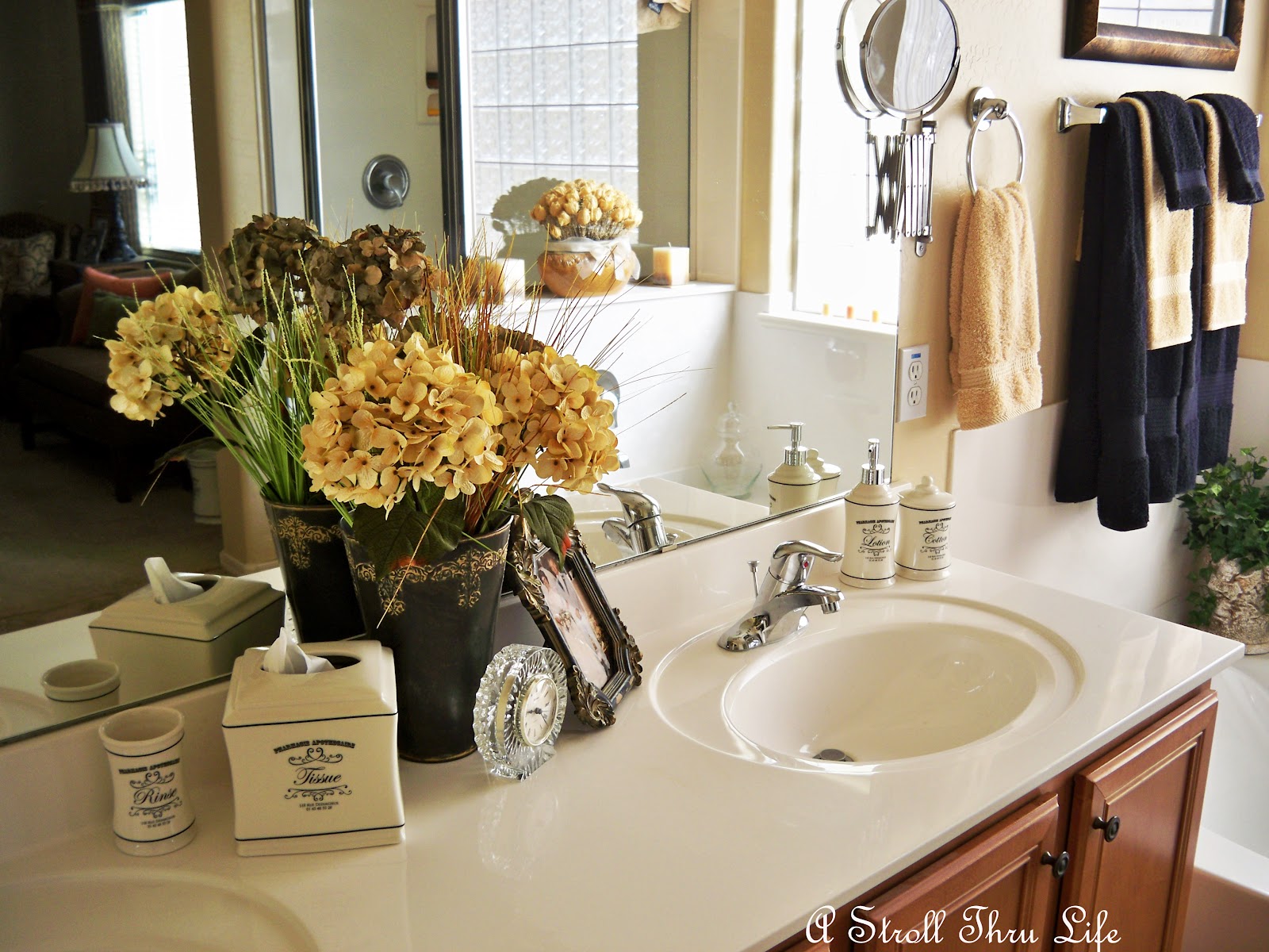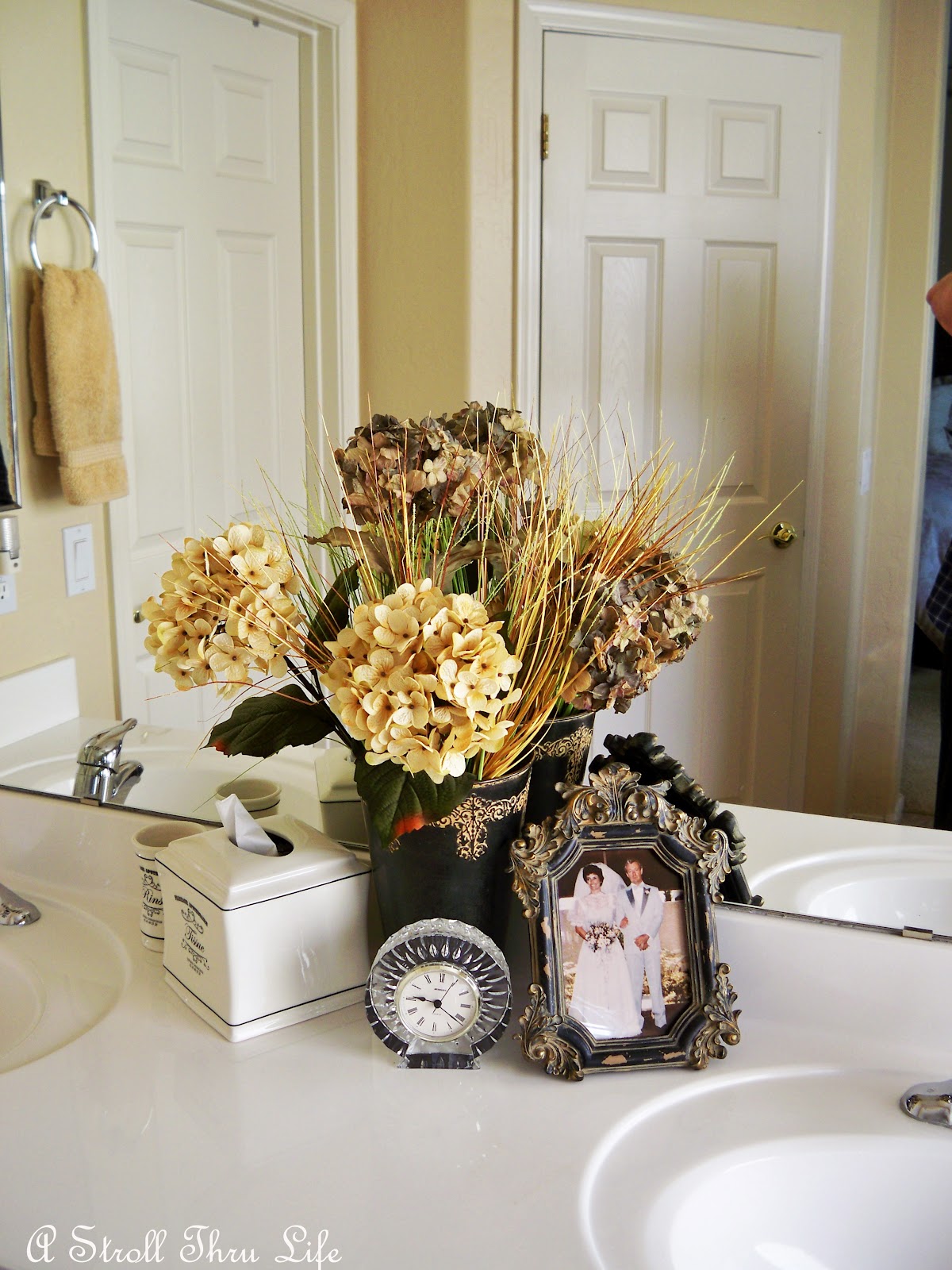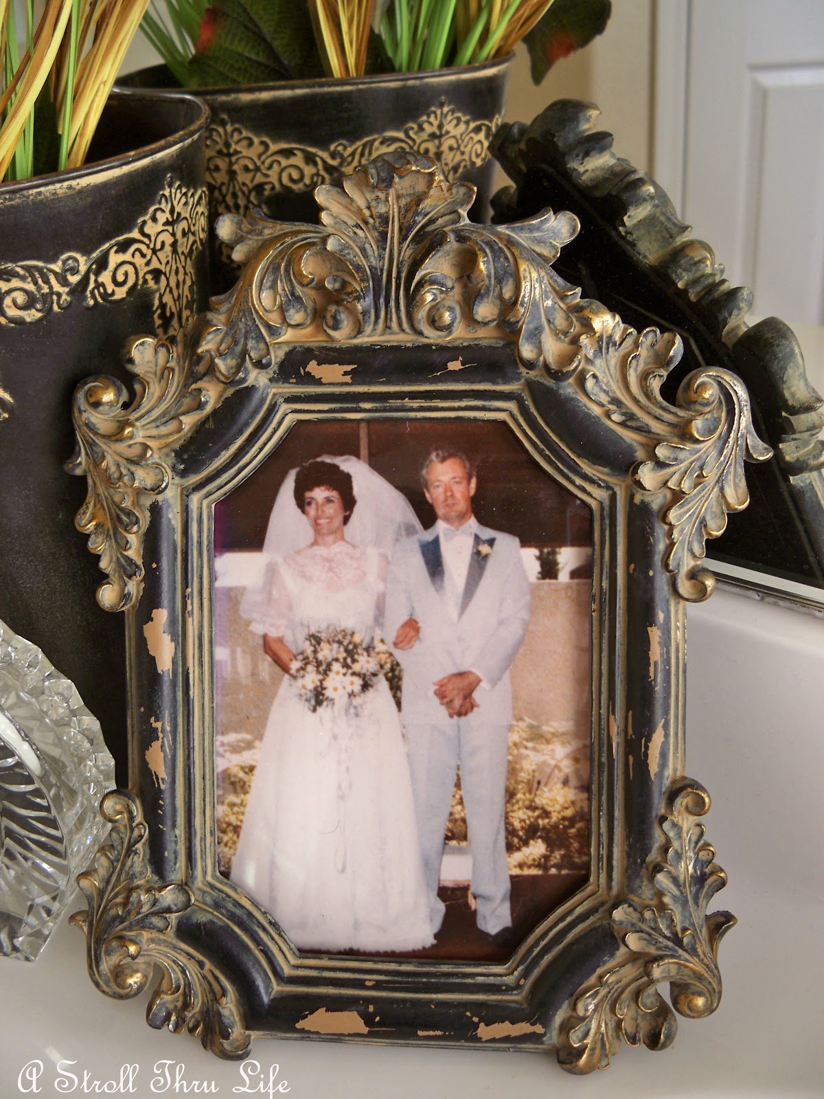 First I found new Frenchy accessories, so I started playing with a few changes. Then I found the wonderful tin that was black and camel to tie in with the room colors and the frenchy design, so that started a centerpiece for the counter. Well, when I saw this frame, of course I had to have it. Look how beautiful it is and so perfect to match the frenchy theme of the rest of the decor. I am on a kick to use more photos in my decor, and since I didn’t want to put our wedding pic in the main living areas, the bathroom is perfect and the frame is perfect.