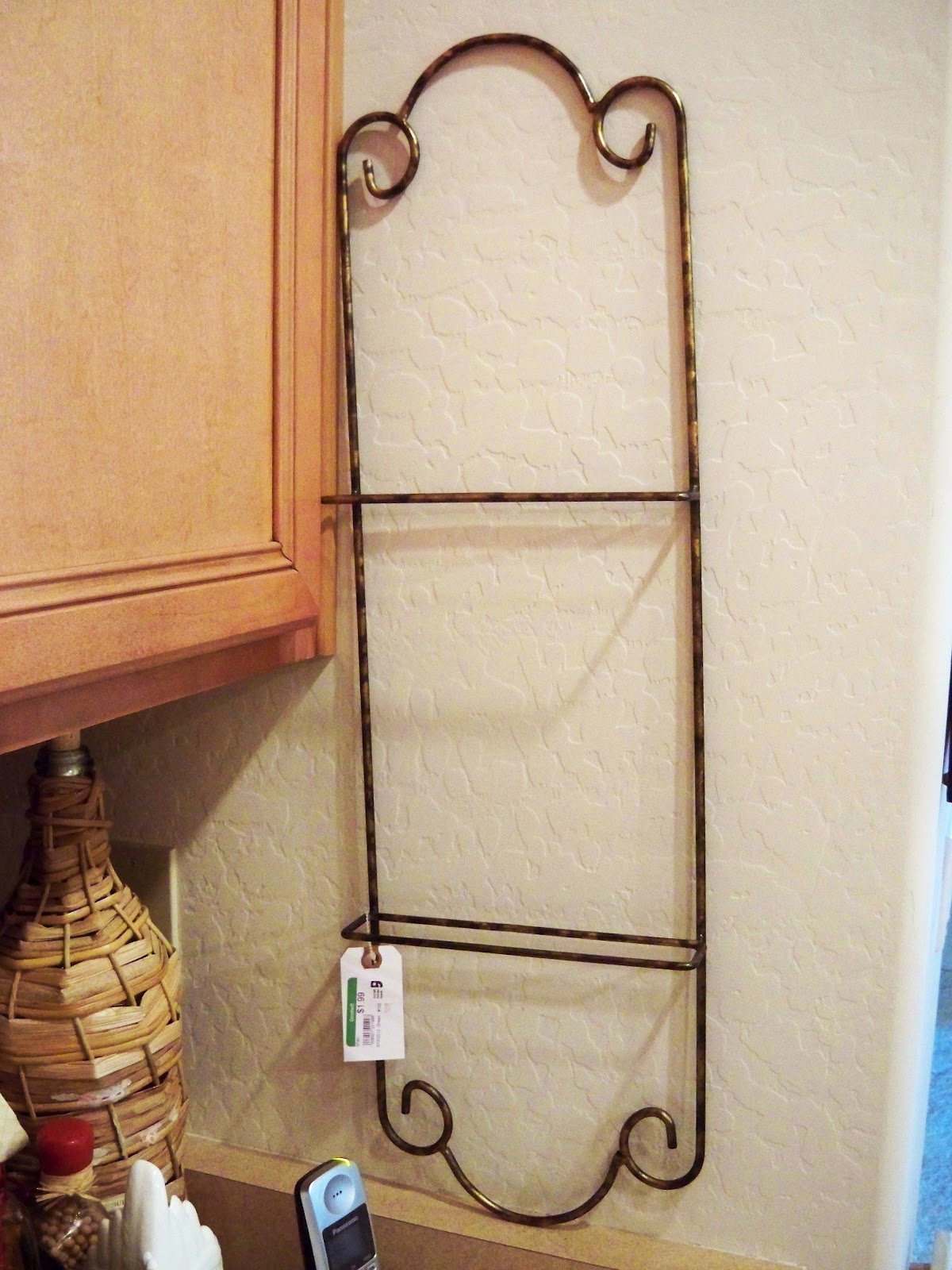 I live in a house with very little wall space. Windows everywhere, and in the kitchen there are no walls at all. Just tiny slivers at the end of the cabinets, so when I found this plate rack at GW for $1.99, I knew it would fit on one of those small slivers of space.