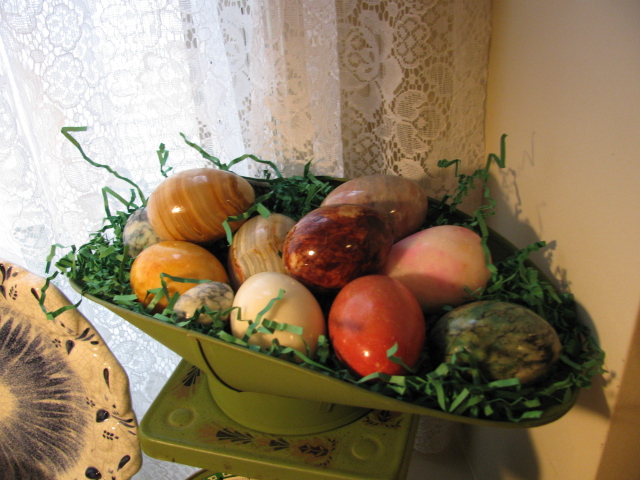 I collect and love marble eggs, so when I saw this wonderful collection displayed in the antique scales that Designs by Cleo created, I was definitely drooling. It is just a tiny part of her Easter decor, and you really have to see it.