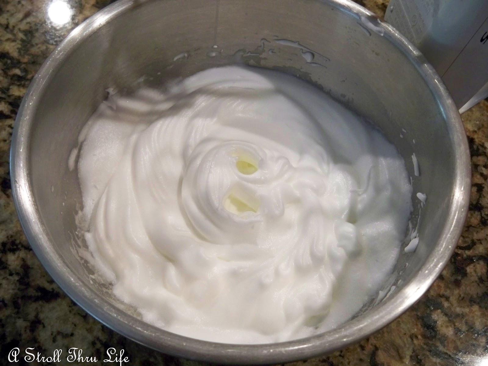 Beat egg whites until soft peaks, add about 1/3 c. sugar and beat until stiff peaks.