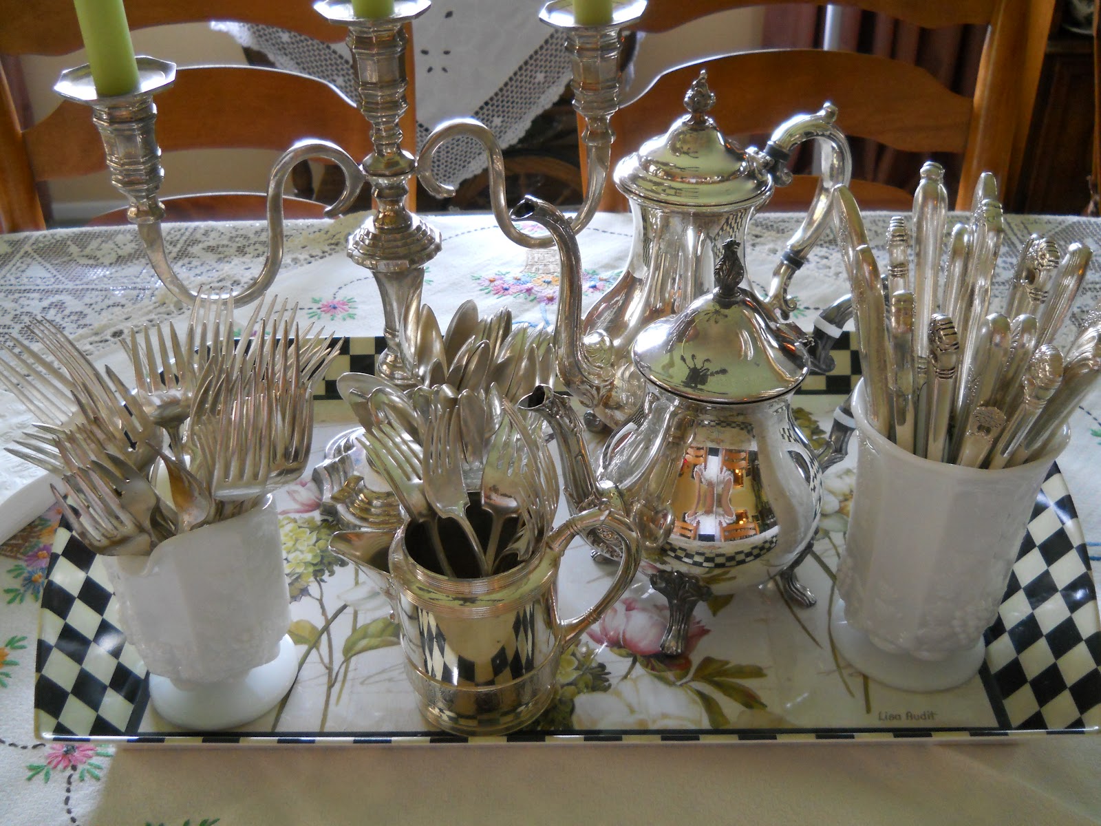 Mona at Wsprsweetly of Cottages found this gorgeous tray and then placed all of this fabulously stunning silver on it. Totally stole my heart. You know how I love my silver and this is all wonderful. Go see what else she found. Great treasures. (Just as a sidenote, blogging is amazing, Mona and I discovered that we went to High School together. You never know who you will re-meet. How fun is that.)