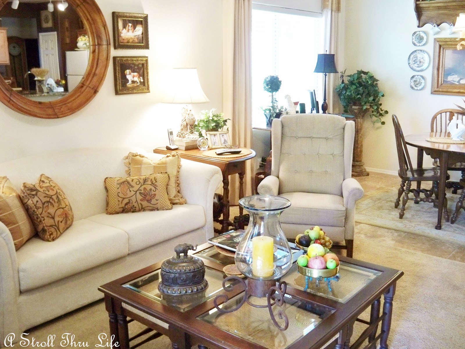 The plaid pillow matches fabric that is on the top of the drapes, so it definitely stays. The next pillow is a fabric that I also made table runners for the breakfast room table so the two areas coordinate.