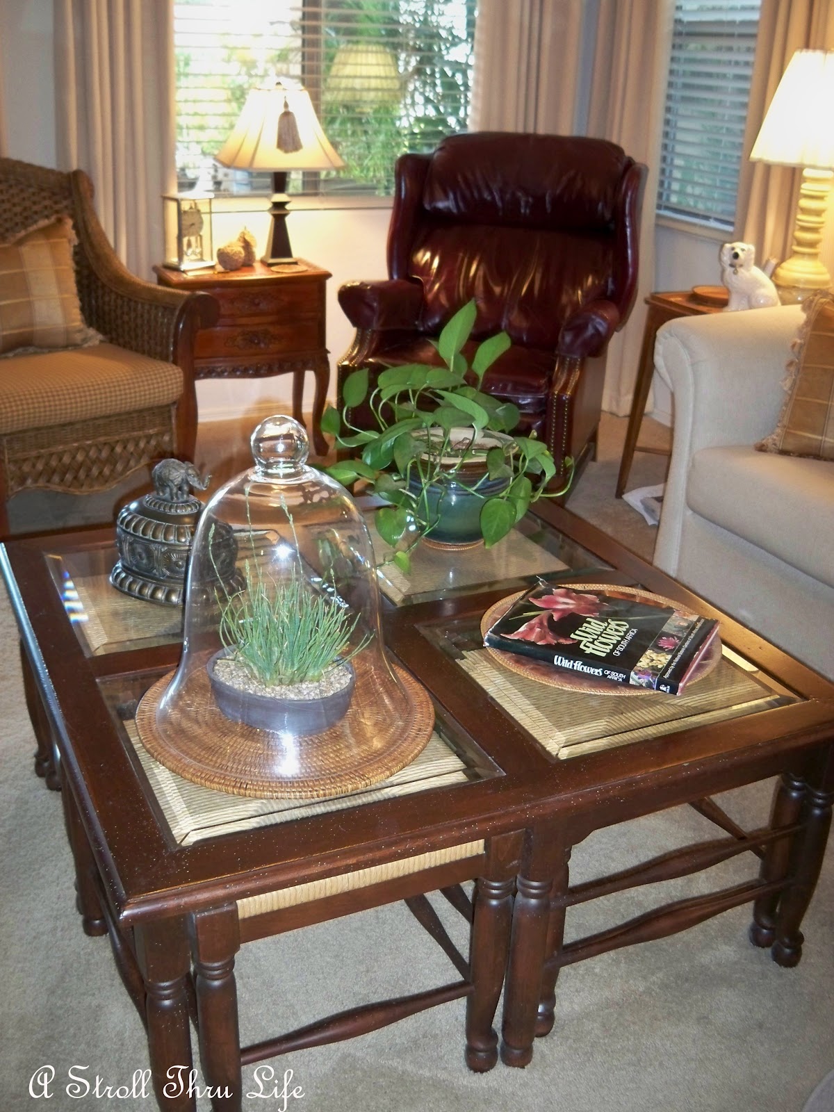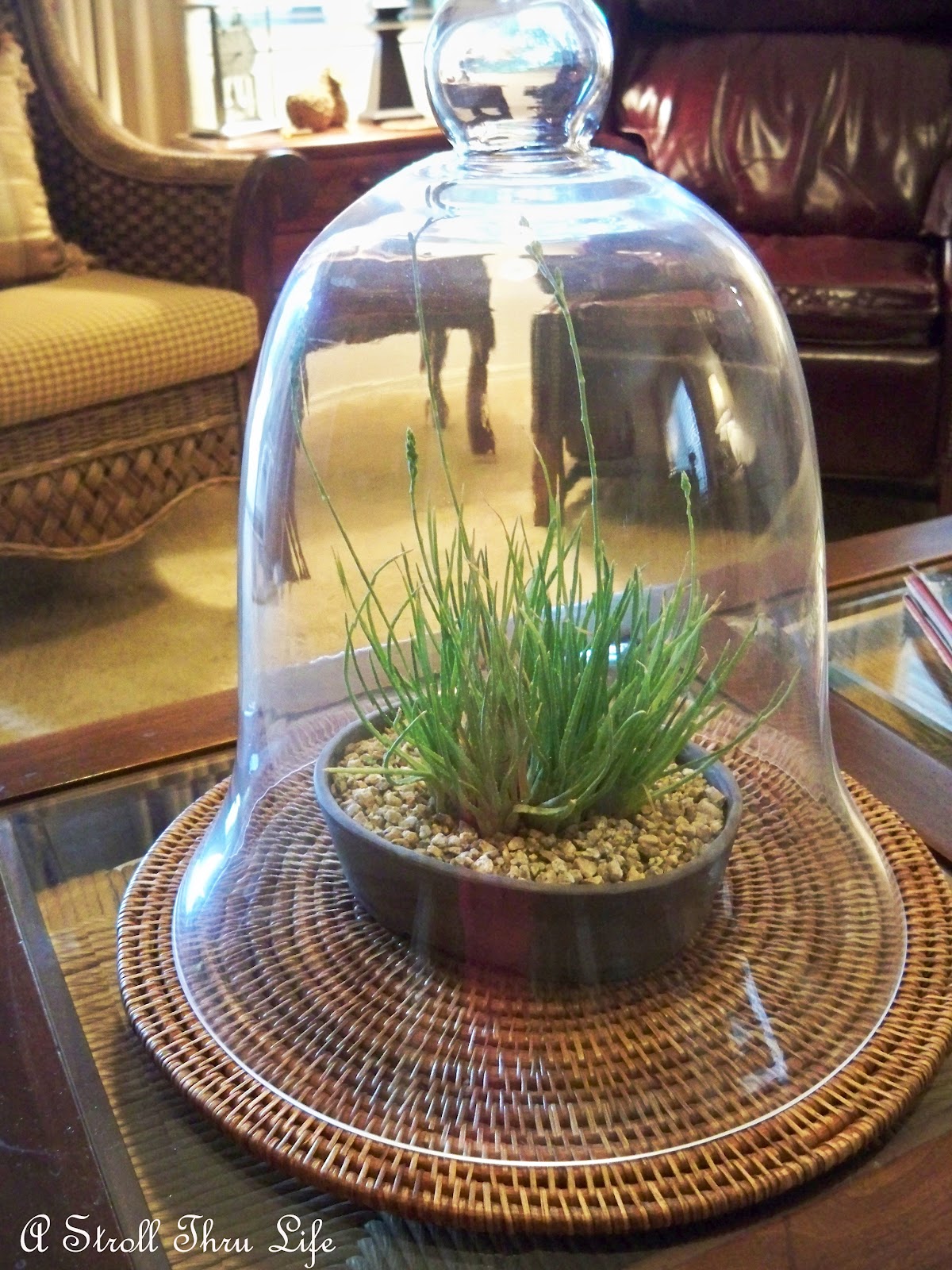 While I was trying to put a couple of things together, DH called me to the family room and said “Show Mine – Show Mine”. I got a chuckle that he had gone outside and found one of his rare plants and put it under my really huge cloche. He insists that his is the proper use of the cloche. lol, This man just doesn’t realize what all we ladies can dream up to put under one. lol ( I love that he likes to join in on the fun. He thought he was really clever. )