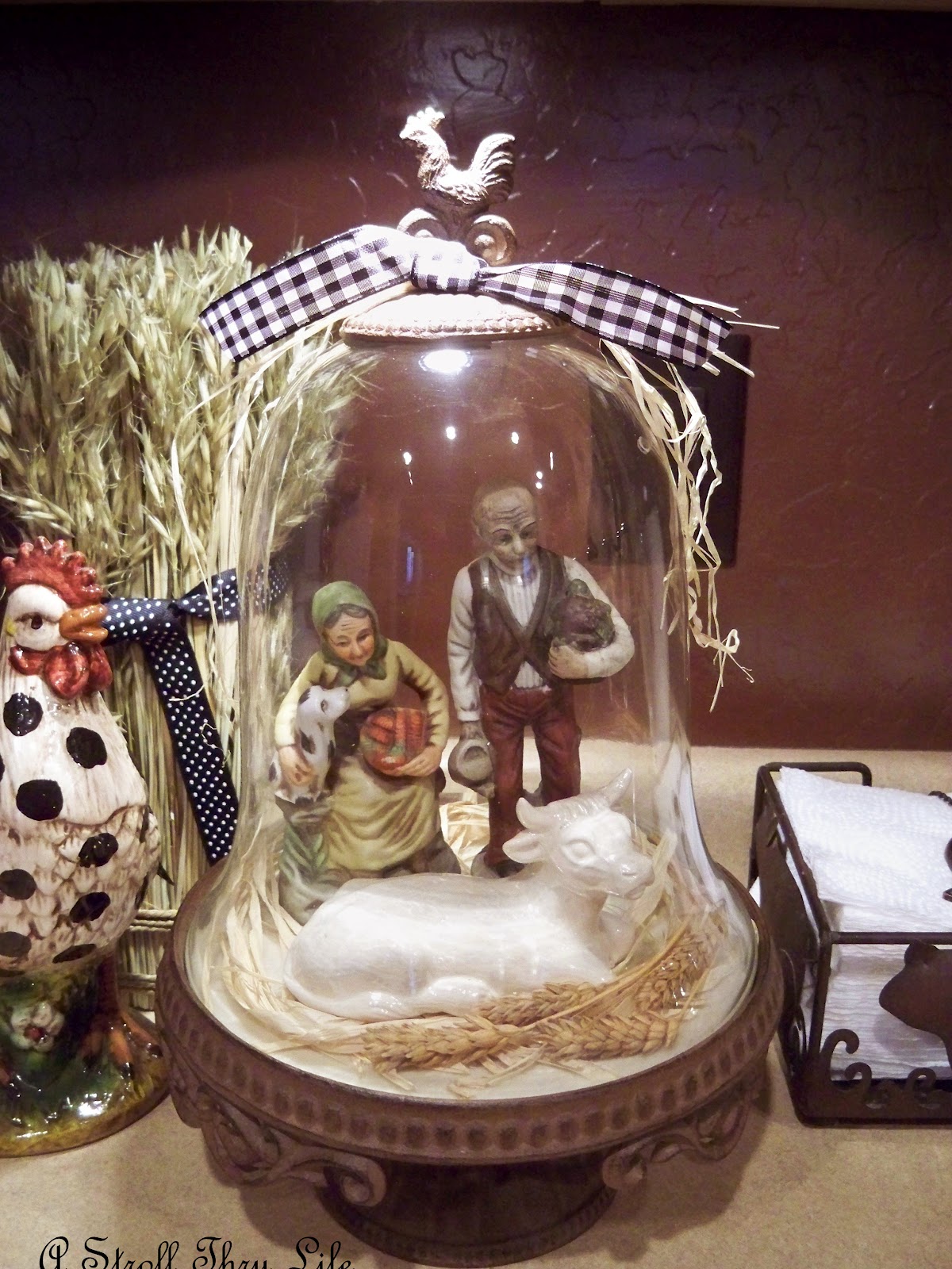 There are two cloches that are always on my kitchen counter. They were both gifts from my son, so they are super special to me. They change often, however, I think you have seen these displays before. My cute little farmer couple and a cow in my favorite rooster cloche.