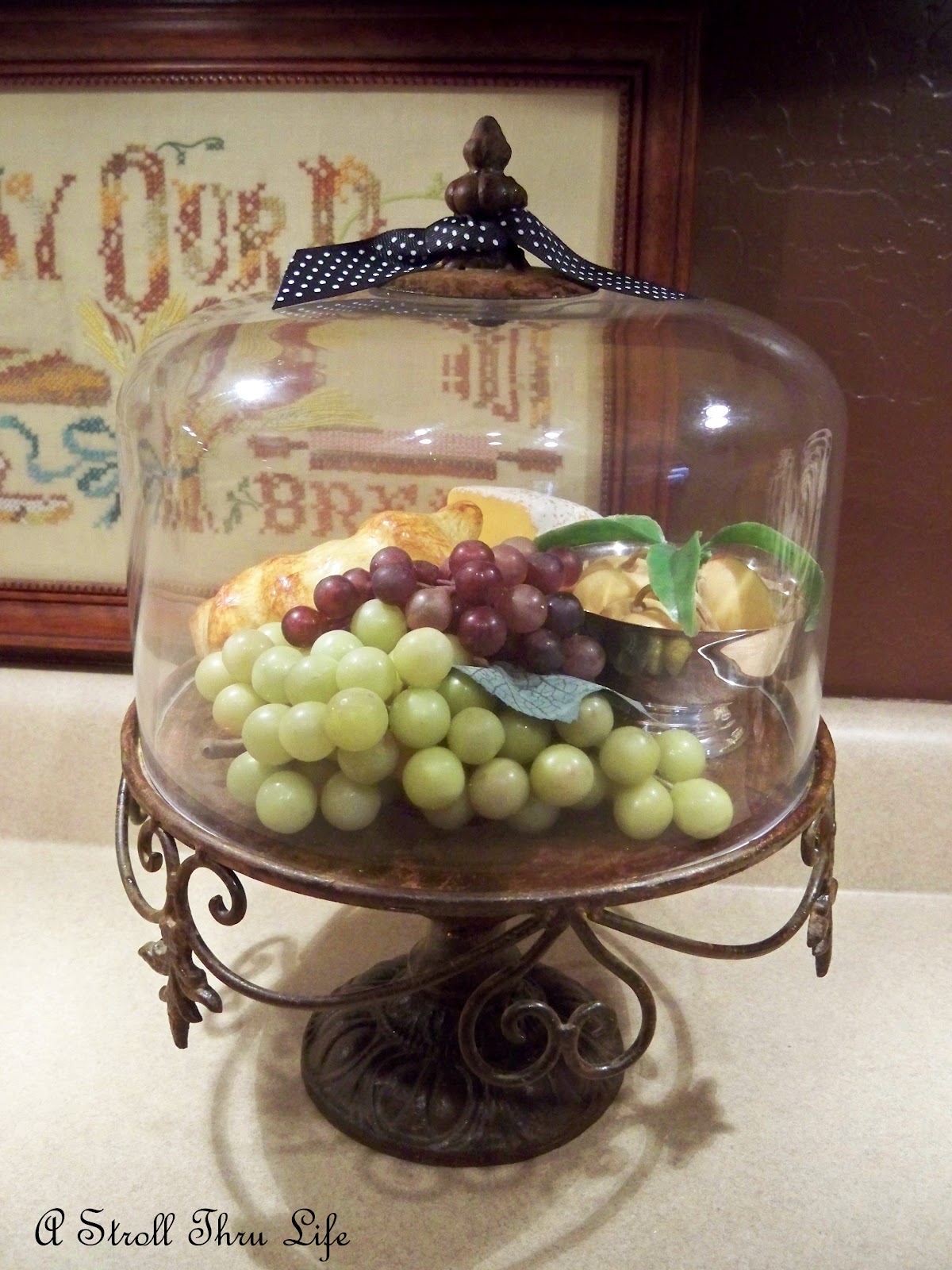 The cakestand coordinates with the rooster cloche and right now it is holding some faux cheese, grapes and croissants.