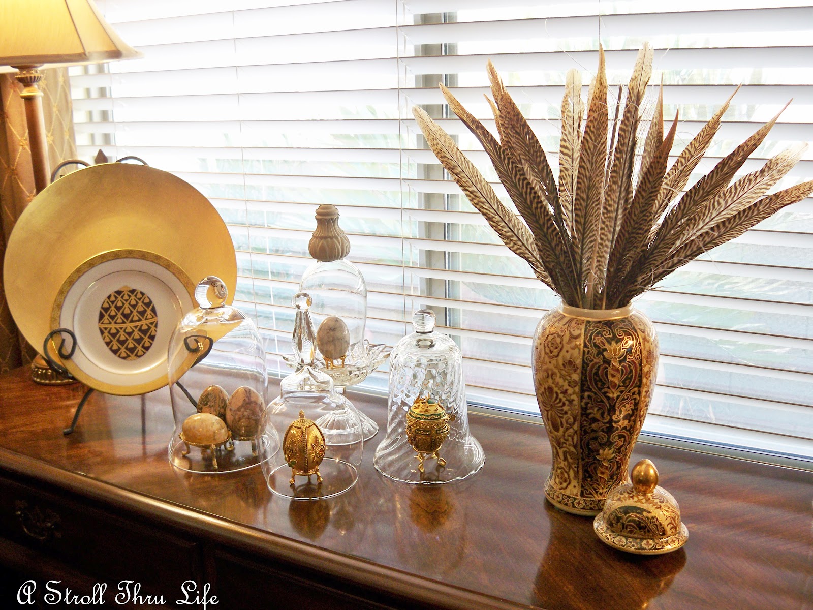 The cakestand coordinates with the rooster cloche and right now it is holding some faux cheese, grapes and croissants.