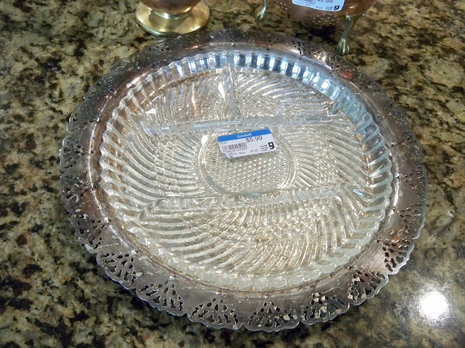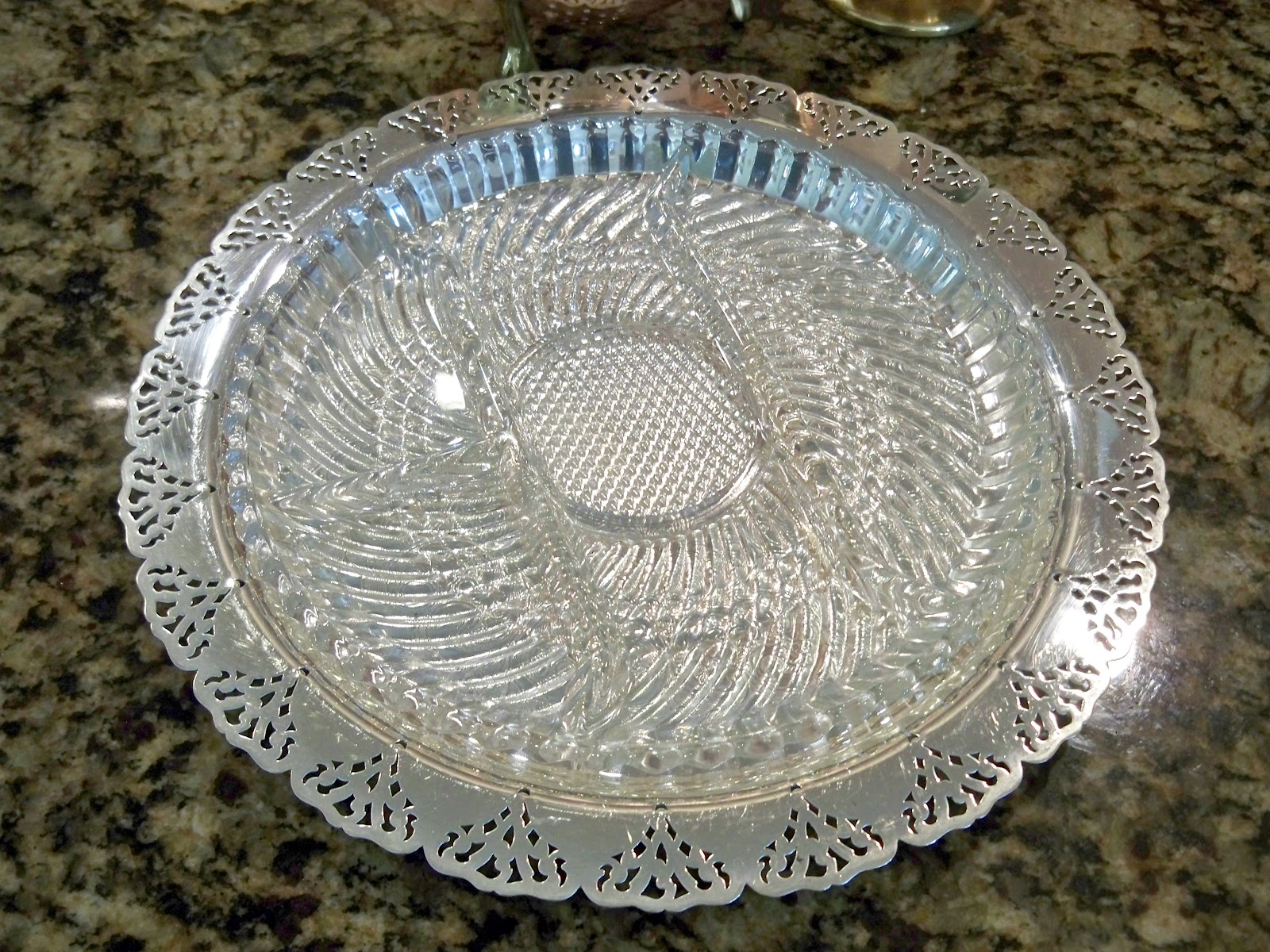As usual, I did find a couple of things at my Goodwill this week. I always love it when I find silver and this week there was a real treasure. I love to have a relish tray assembled for every dinner and get together, it just seems like our family always enjoys all the little extras. This glass and silver tray is stunning.