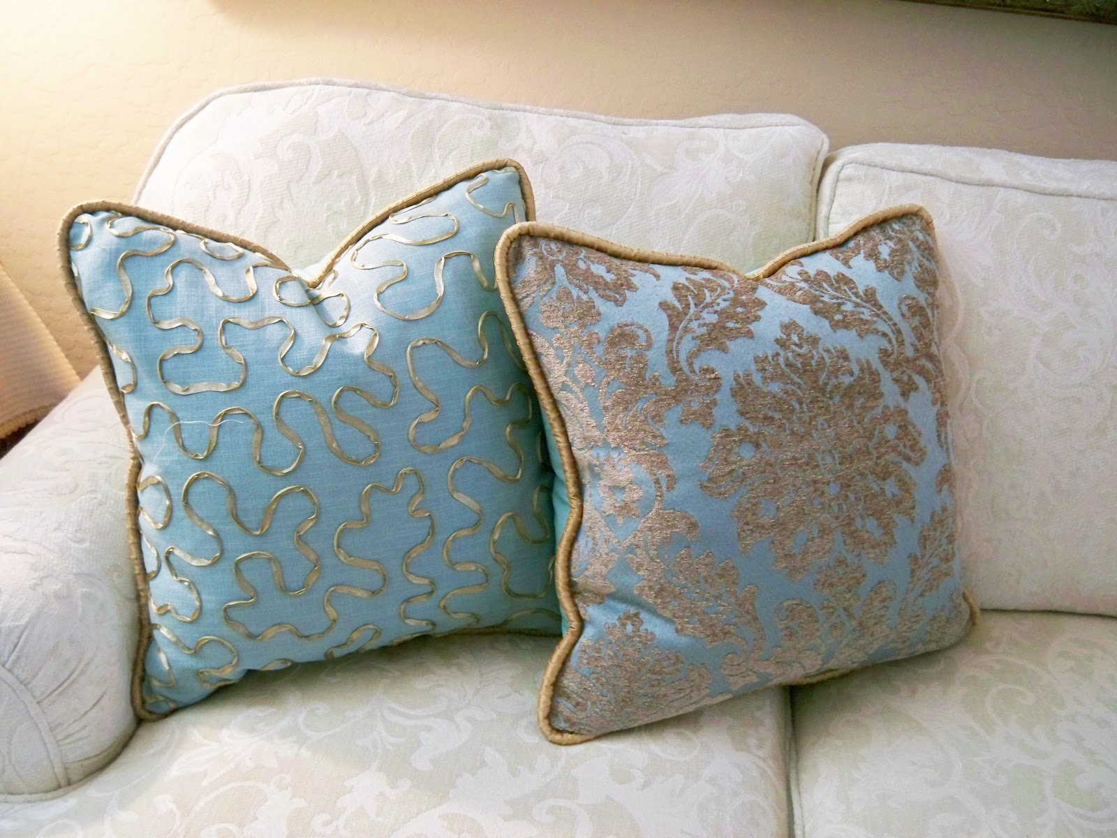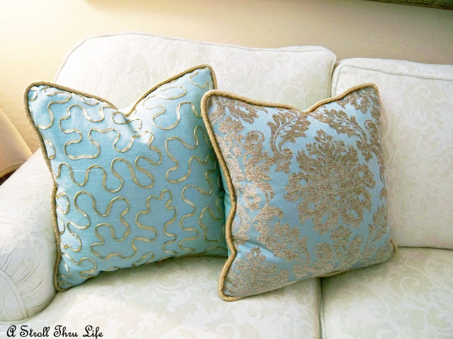 I found a cotton fabric for the back of the pillows that matches the aqua perfectly, so I was able to get two pillows out of each 1/2 yd.  Great way to stretch your dollars when using really expensive fabric, just use it for the pillow fronts.  I also had a remnant piece of gold fabric that matched the gold ribbon on the fabric and used that for the cording.  Saved some money and used up my remnants.