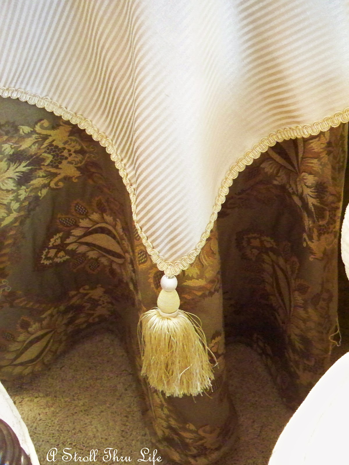 The gimp trim and tassels were also in my stash, so I managed to create something with a little character and spent zero dollars.  The tassels were a last minute thought, but I really like them.