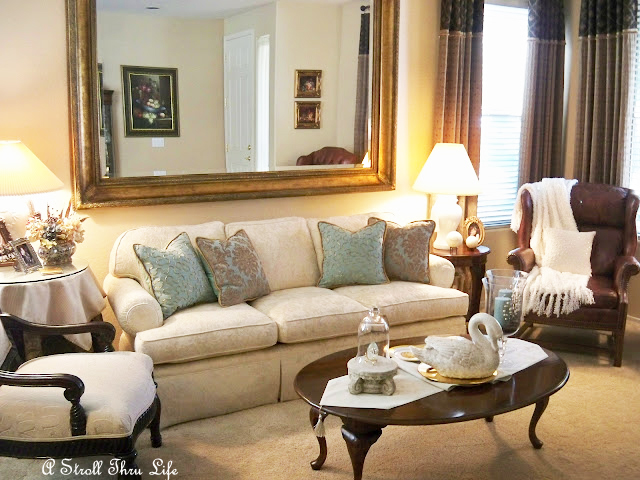 I had a small piece of this stripe fabric left from other projects,  so I made a table topper for the table.   I thought I needed something a little lighter and the gold stripe tied in with the gold ribbon on the pillows.