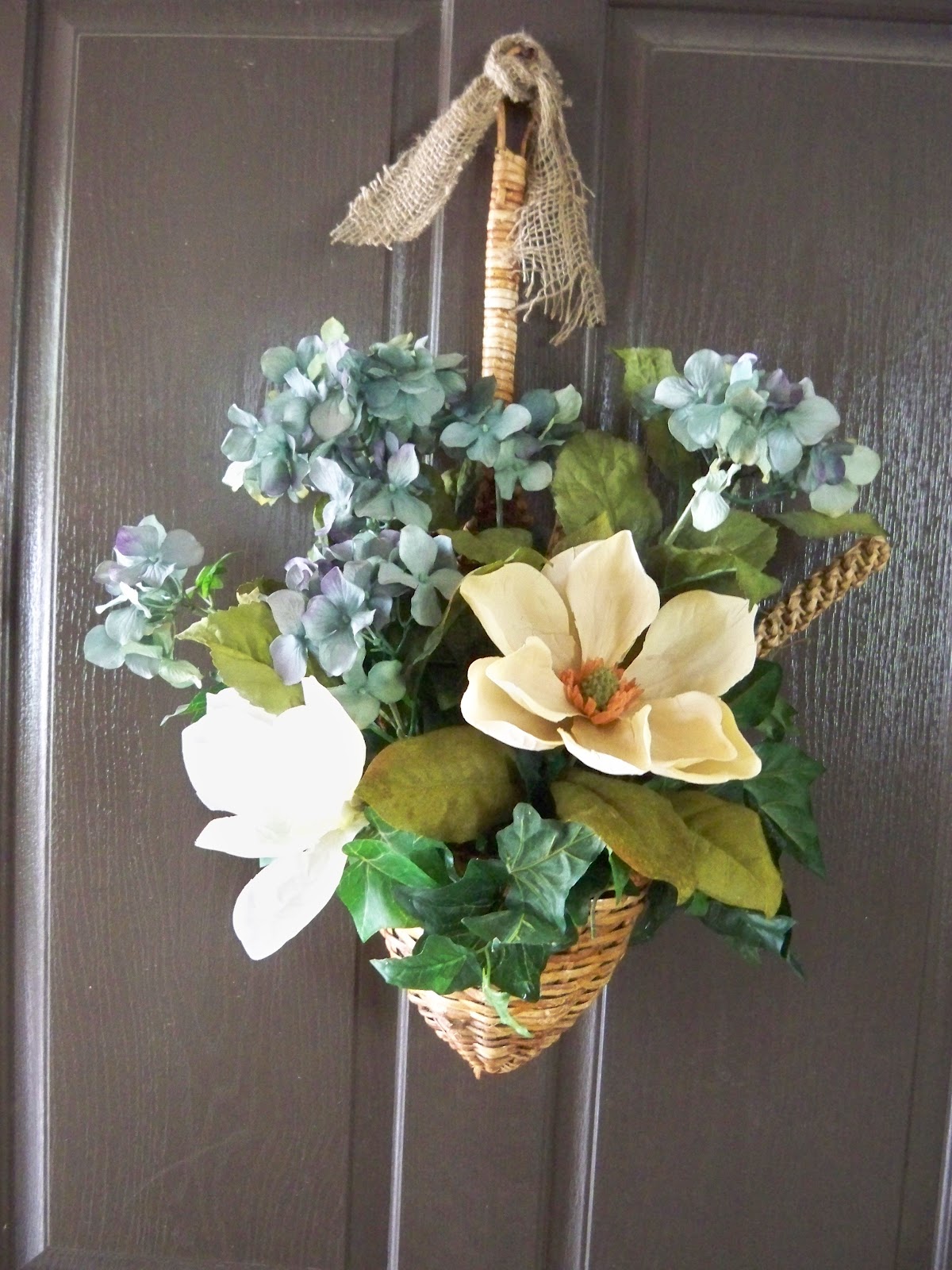 So I took the basket down and redid the floral arrangement.  I put some aqua hydrangeas in it to tie in the porch cushions.