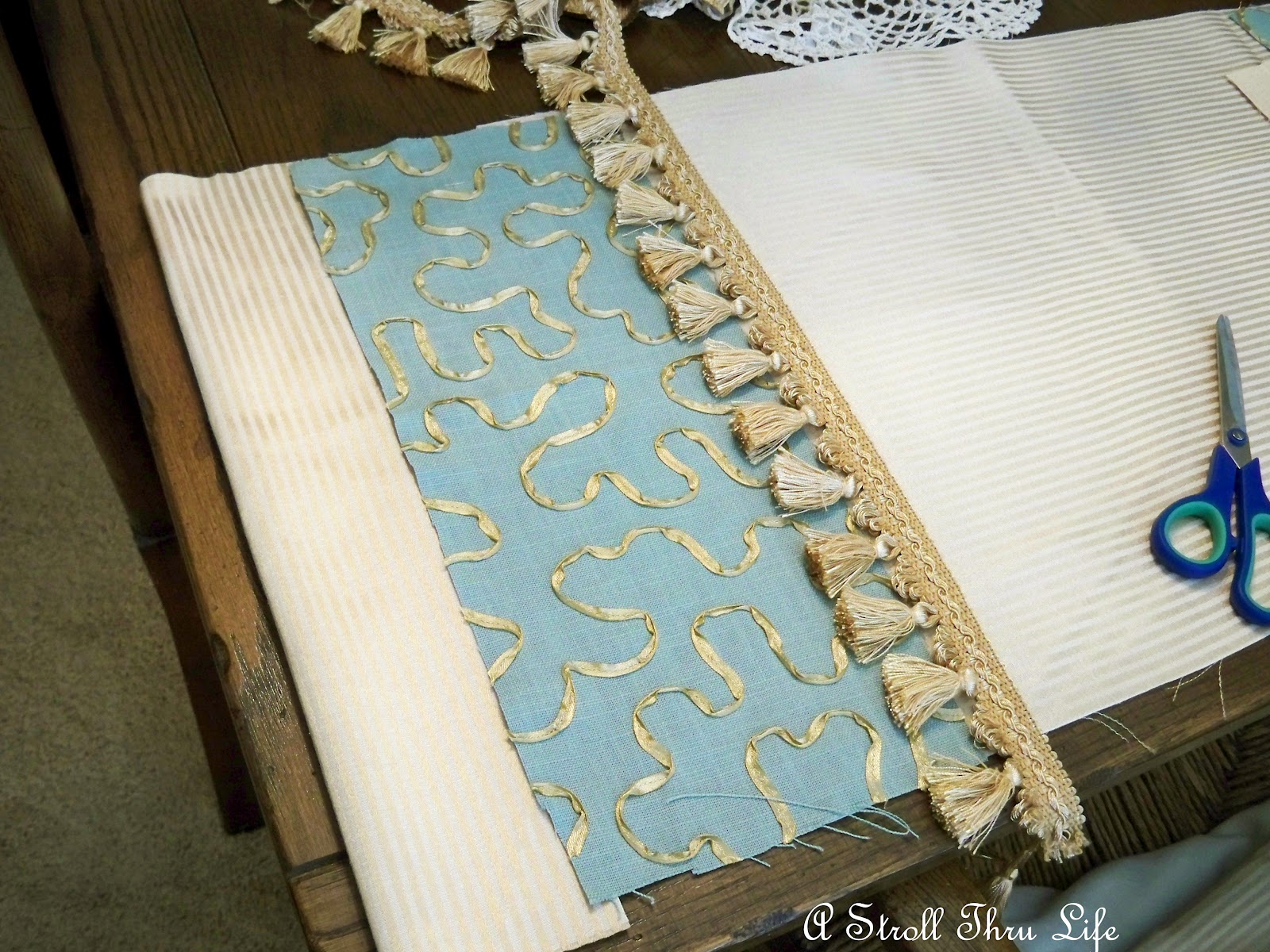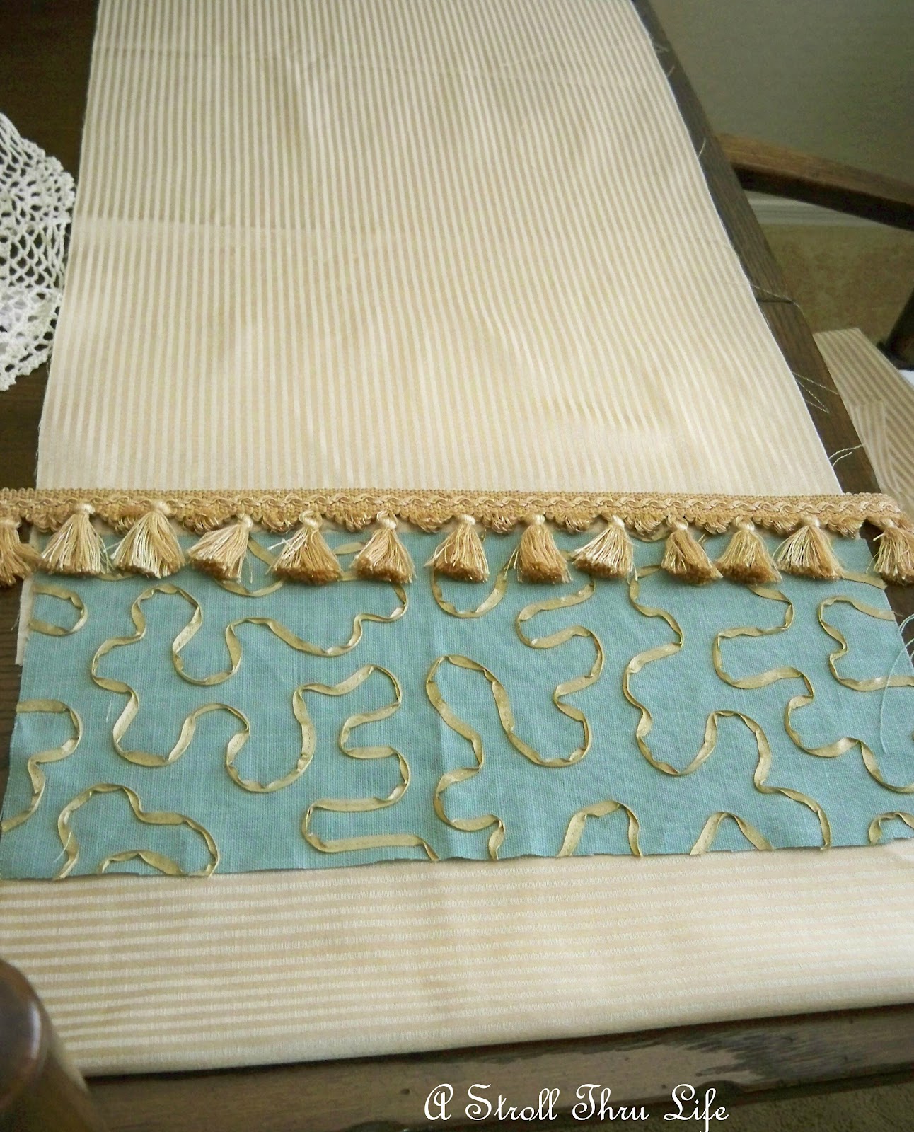 I used a remnant piece of gold and cream stripe for the table topper in the living room and I have 1 1/2 yd piece of that left, so I cut off a 16″ wide strip, cut the aqua in half for two 9″ pieces, added another small band to the bottom and then found just enough left over fringe in my stash to go across the top of the aqua.  I’ve layed it all out to take a look and see if it is going to work, or have I gone nuts.
