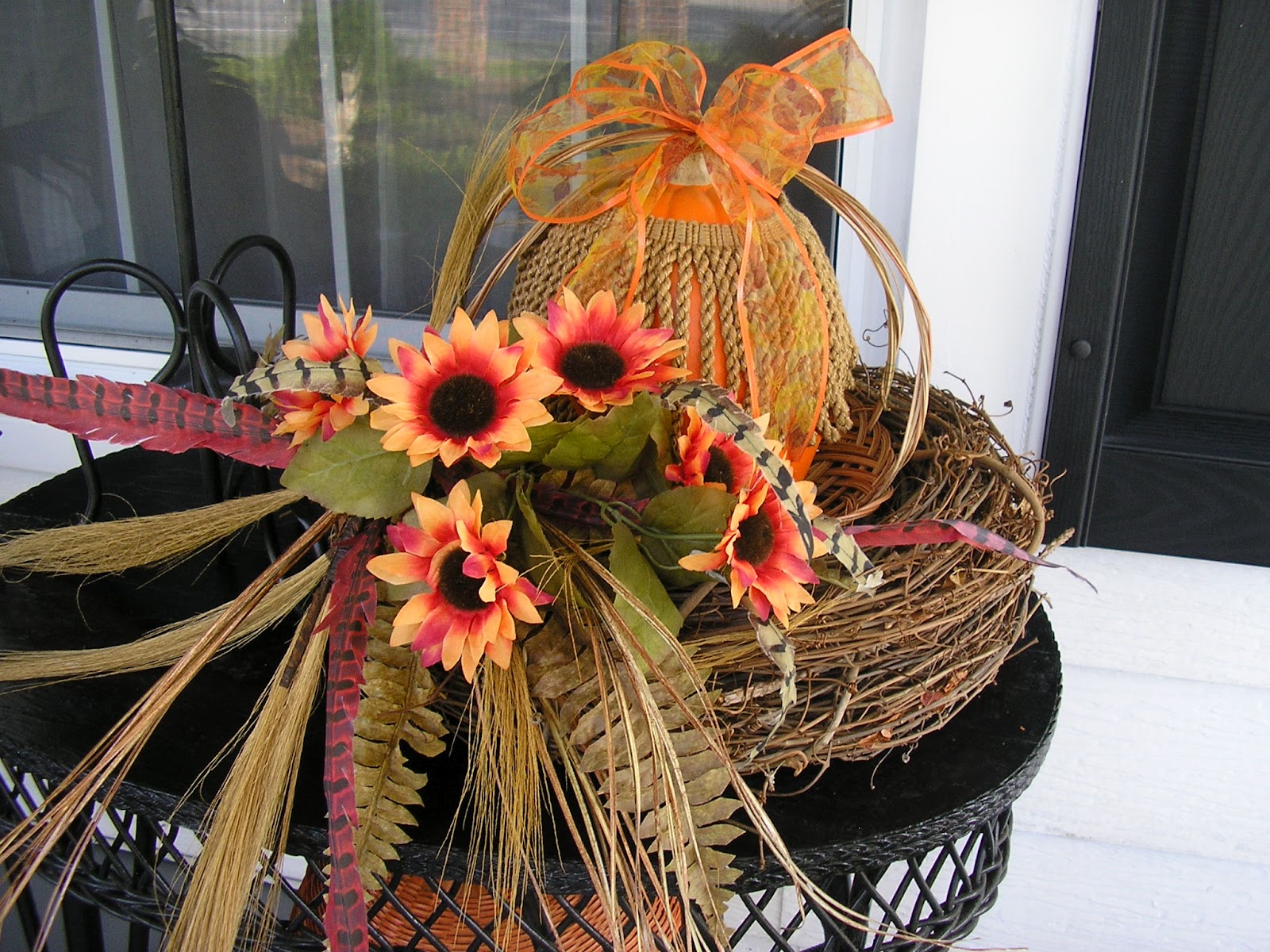 Copper~n~Things created this fabulous vignette. Look at the pumpkin topped with the fringe. Love it. Go over and see Sandy’s porch. You will love it.