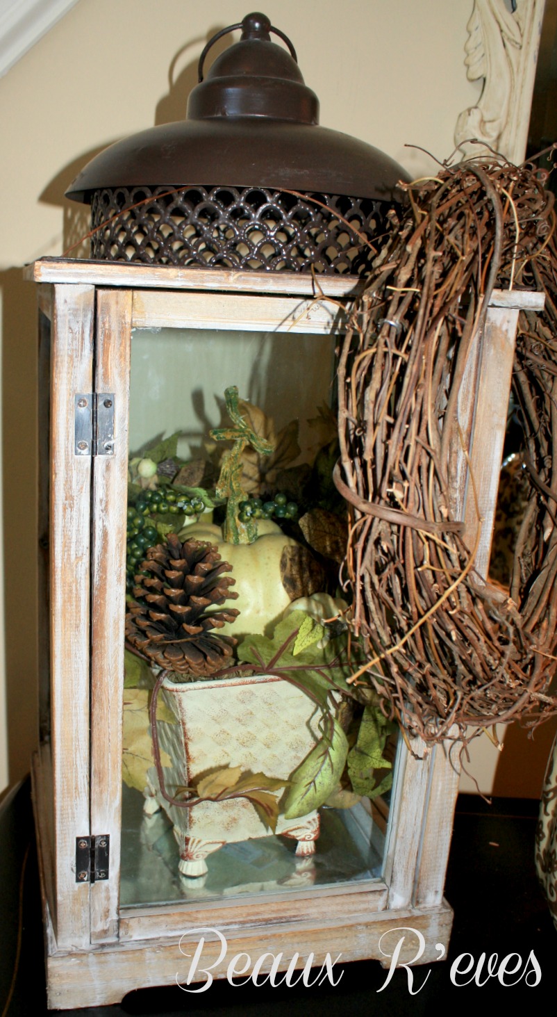 Cindy at Beaux R’eves has created a beautiful fall vignett in her entry that is stunning.  See how she placed a fall arrangement inside the lantern.  I never think of these things, this is gorgeous.  Go see the whole vignette, it is so beautiful.