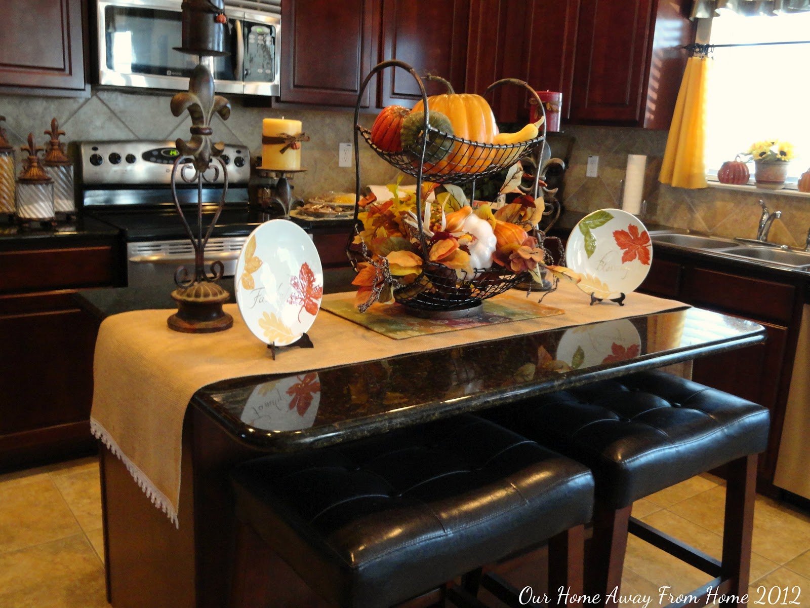 Our Home Away From Home added Fall to her kitchen island with this stunning vignette.  Notice the lace on the burlap runner.  How fun is that.