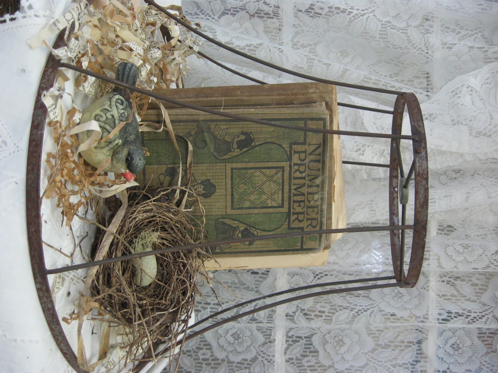 Treasures from the Heart uses an old lampshade frame as her cloche. I just think this is unreal. I loved it and her wonderful vignette.
