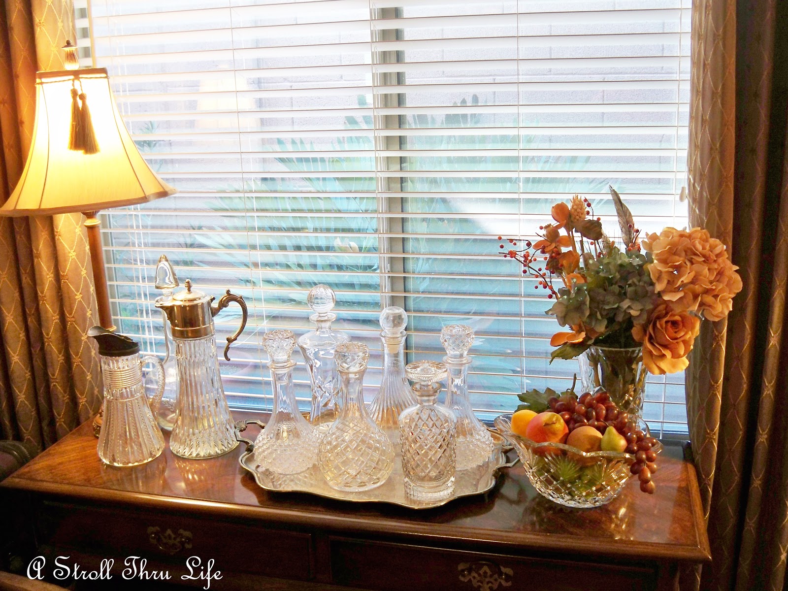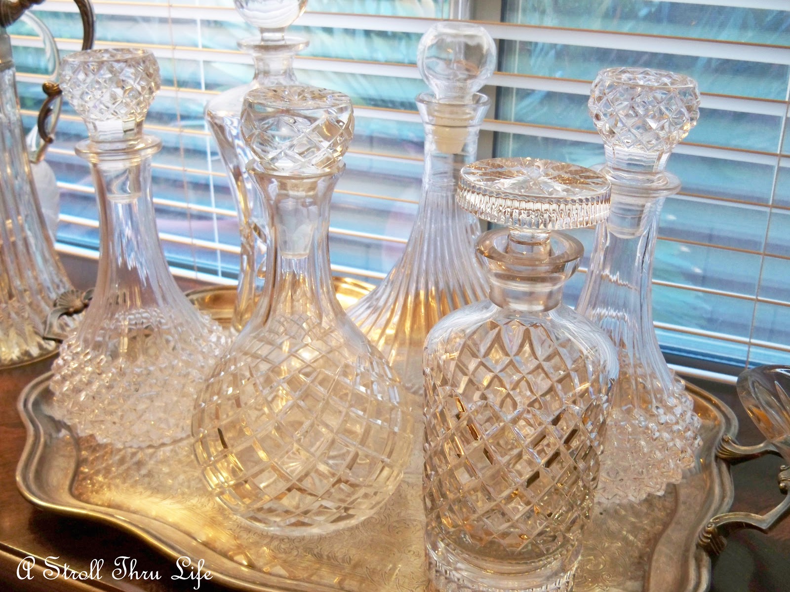 The crystal pitcher with the beautiful pewter spout and the decanter in the back were the only pieces I’ve had for years. The pitcher belonged to my MIL. The silver and crystal pitcher I found at a Thrift-Resale store for $20, it has an insert for ice to keep the drink cold. Fabulous piece.