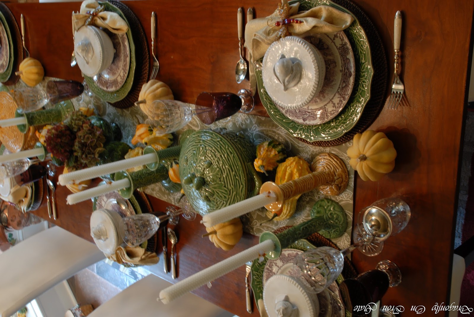 The Dragonfly On Iron Gate has the most fabulous setting complete with a fire in the fireplace for her gorgeous tablescape using some lovely Majolica. Beautiful.