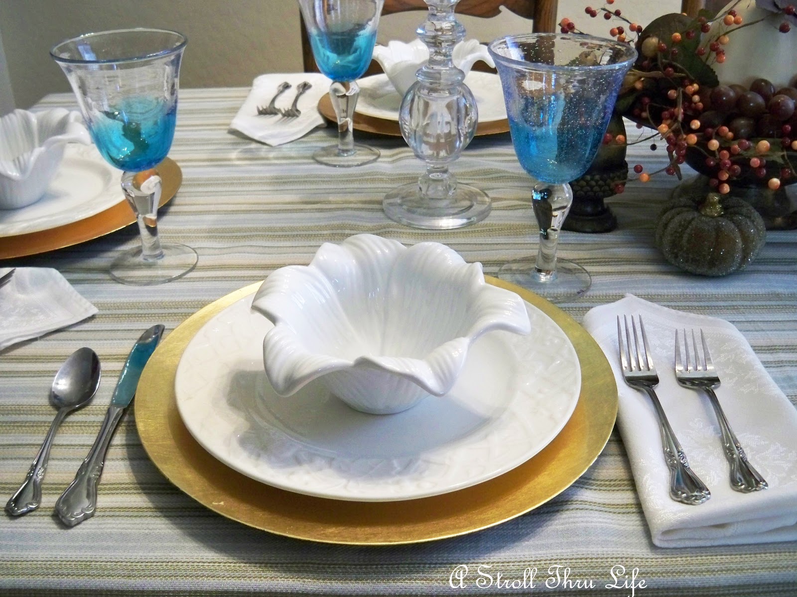 An Aqua and Brown stripe linen tablecloth creates a casual setting, so I kept the placesettings casual too.