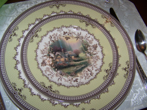 Tablescapes by Bev used her Thomas Kinkade china. I hadn’t ever seen this before, but how fabulous that each plate has a different one of his paintings featured. So beautiful.