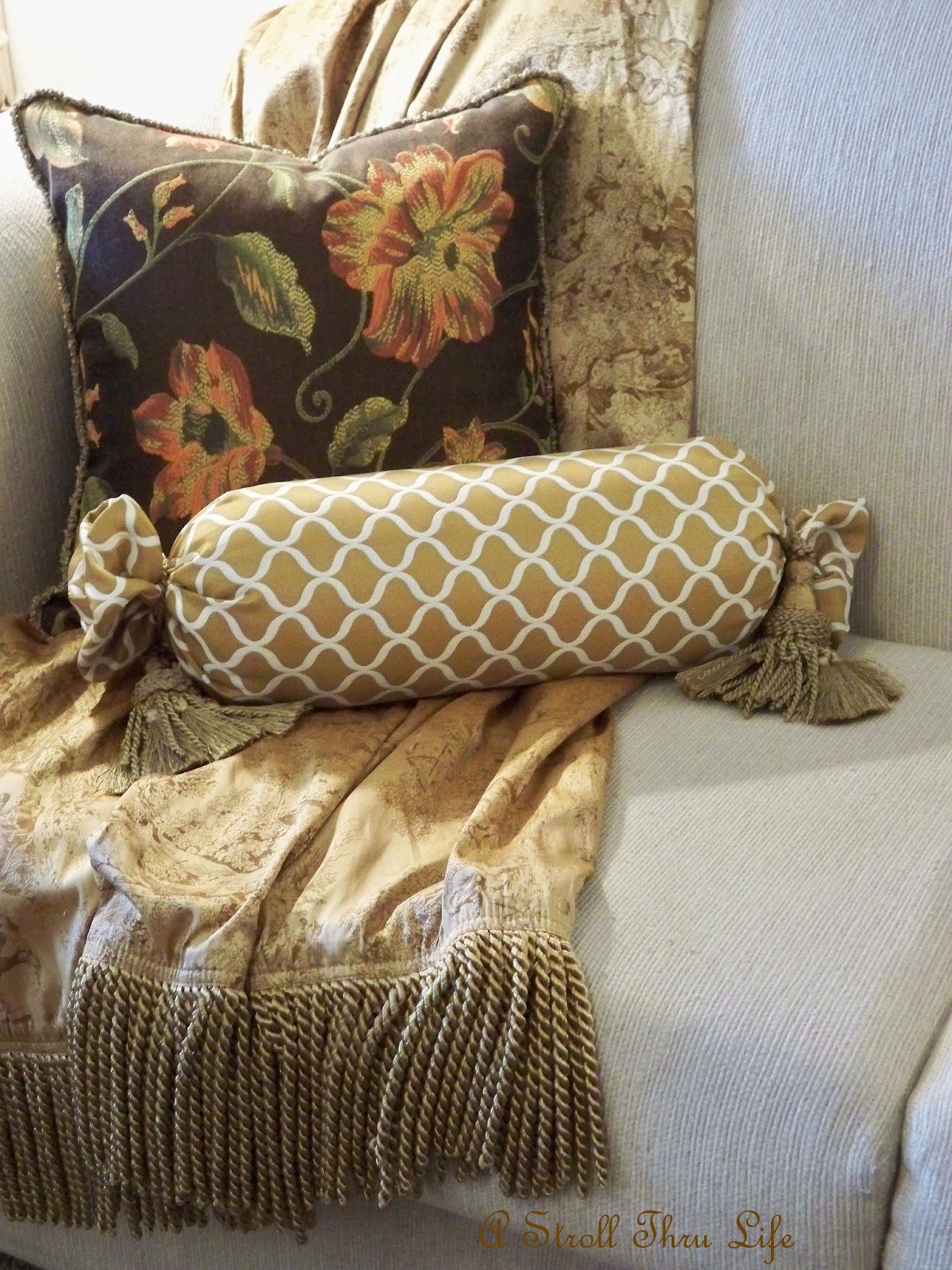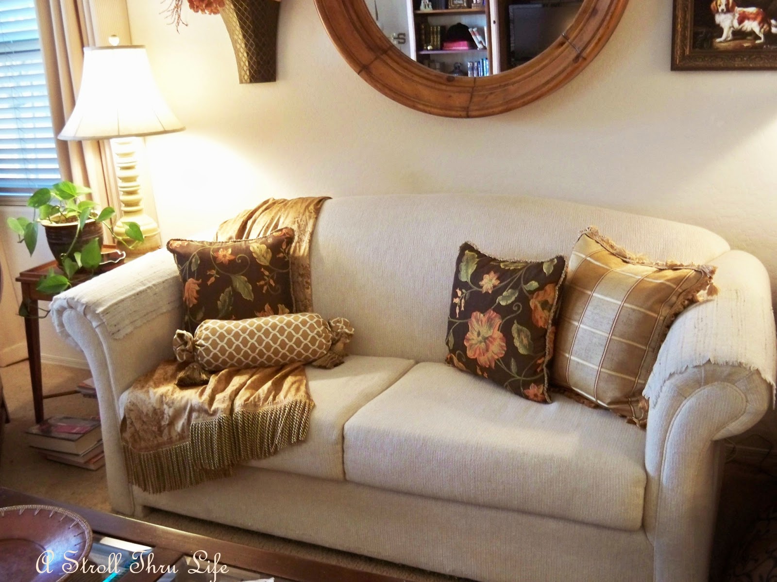 Great fabrics with a mix of chocolate brown, camel, gold and just a touch of green and orange. (Yes, I found some napkins that almost match the sofa and use them for arm covers.  Definitely helps a cream sofa stay cleaner.)