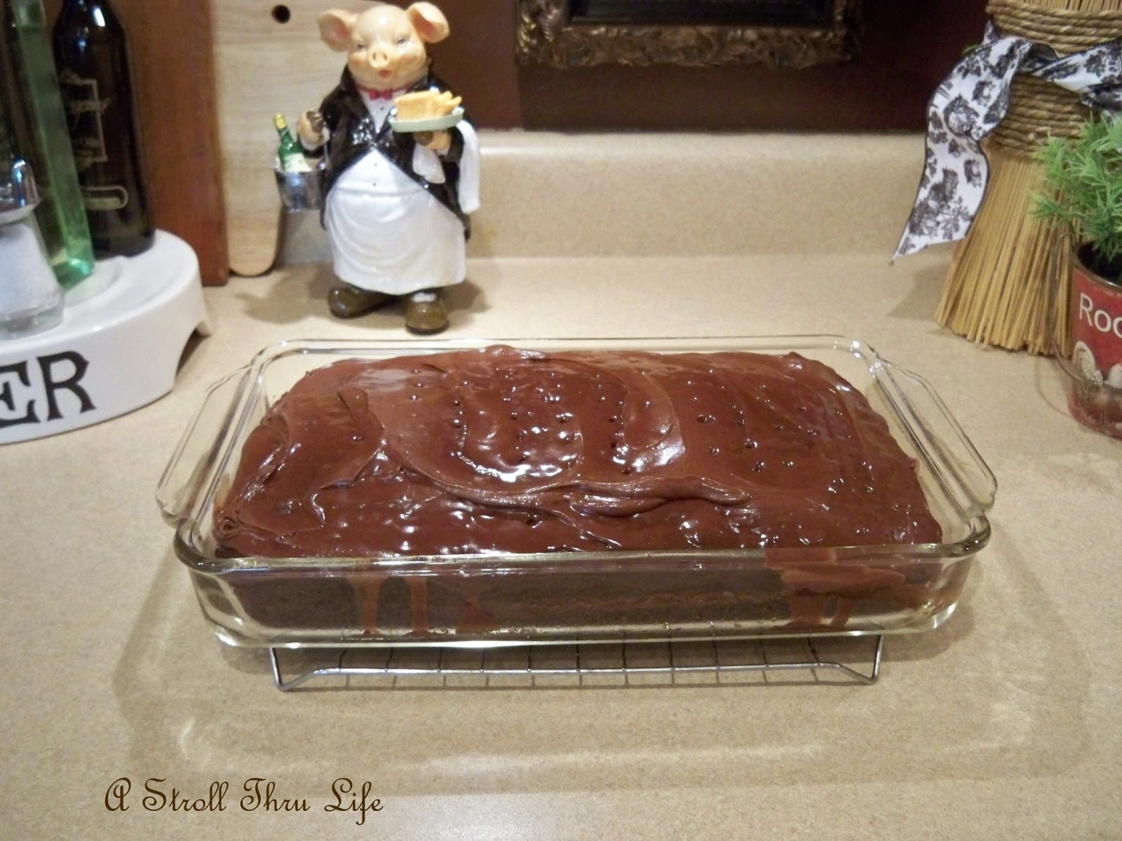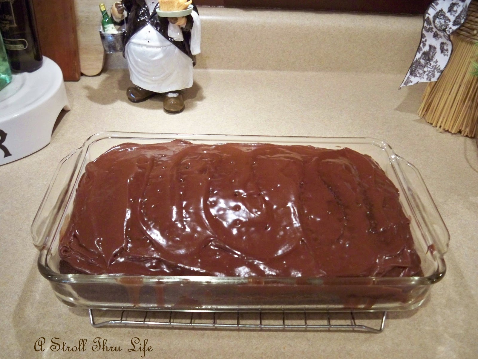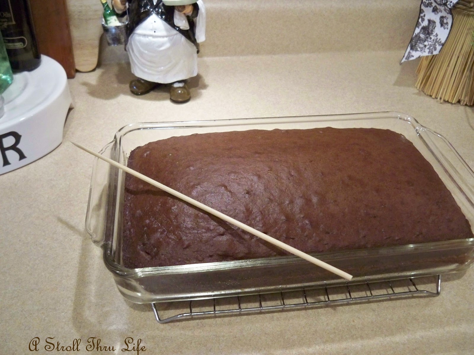 Bake your favorite fudge cake. ( I used a box mix. I learned a long time ago to use my mixer and mix a box cake twice the time recommended and it will totally taste like made from scratch. ) Straight out of the oven place it on a rack to start to cool.